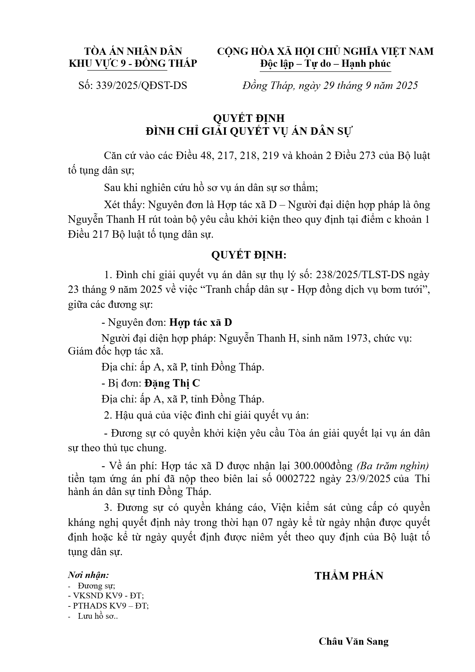 Quyết định số 239/2025/QĐST-DS ngày 29/09/2025 của Tòa án nhân dân khu vực 9 - Đồng Tháp, tỉnh Đồng Tháp về tranh chấp hợp đồng dịch vụ