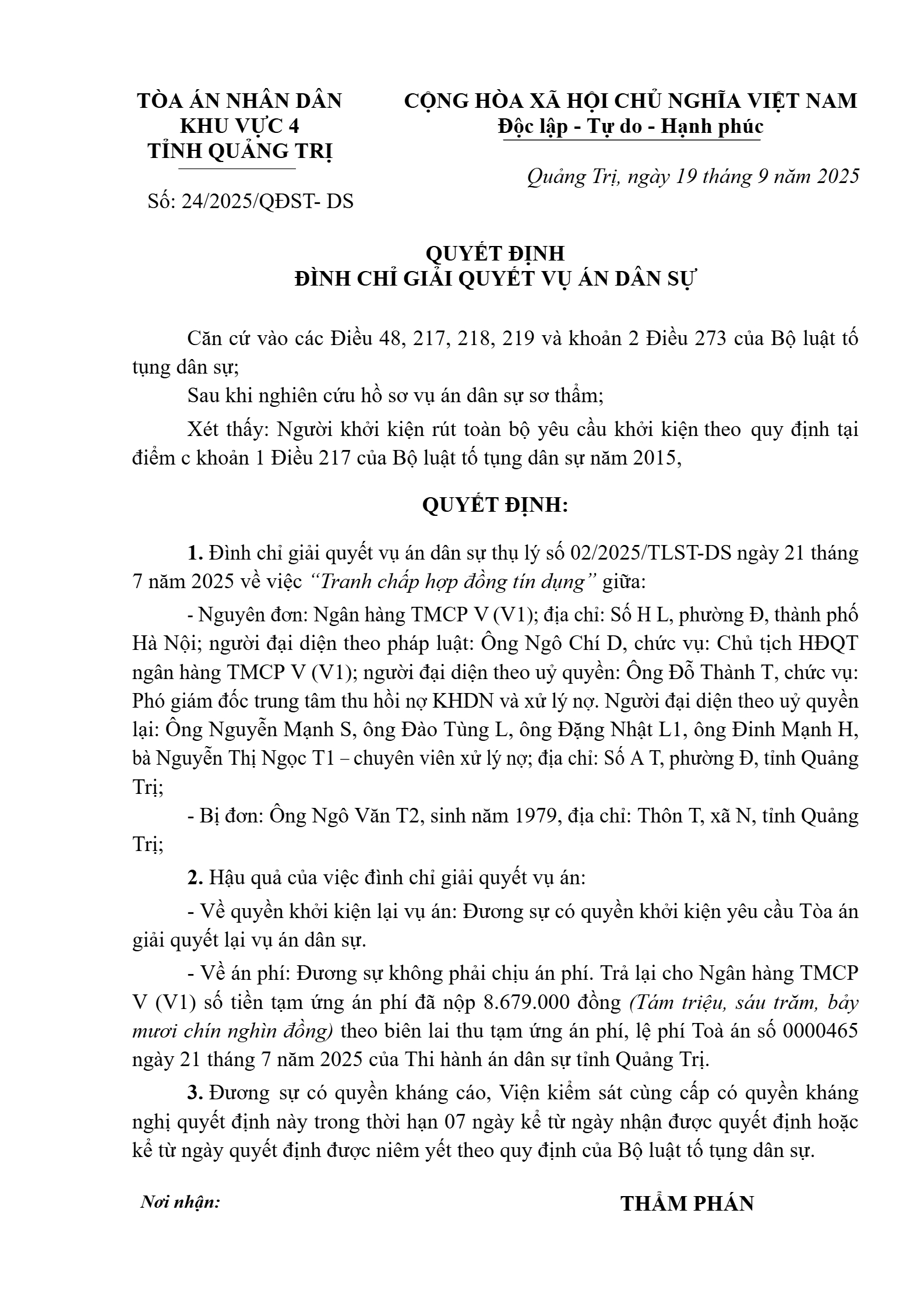 Quyết định số 24/2025/QĐST-DS ngày 19/09/2025 của Tòa án nhân dân khu vực 4 - Quảng Trị, tỉnh Quảng Trị về tranh chấp hợp đồng tín dụng