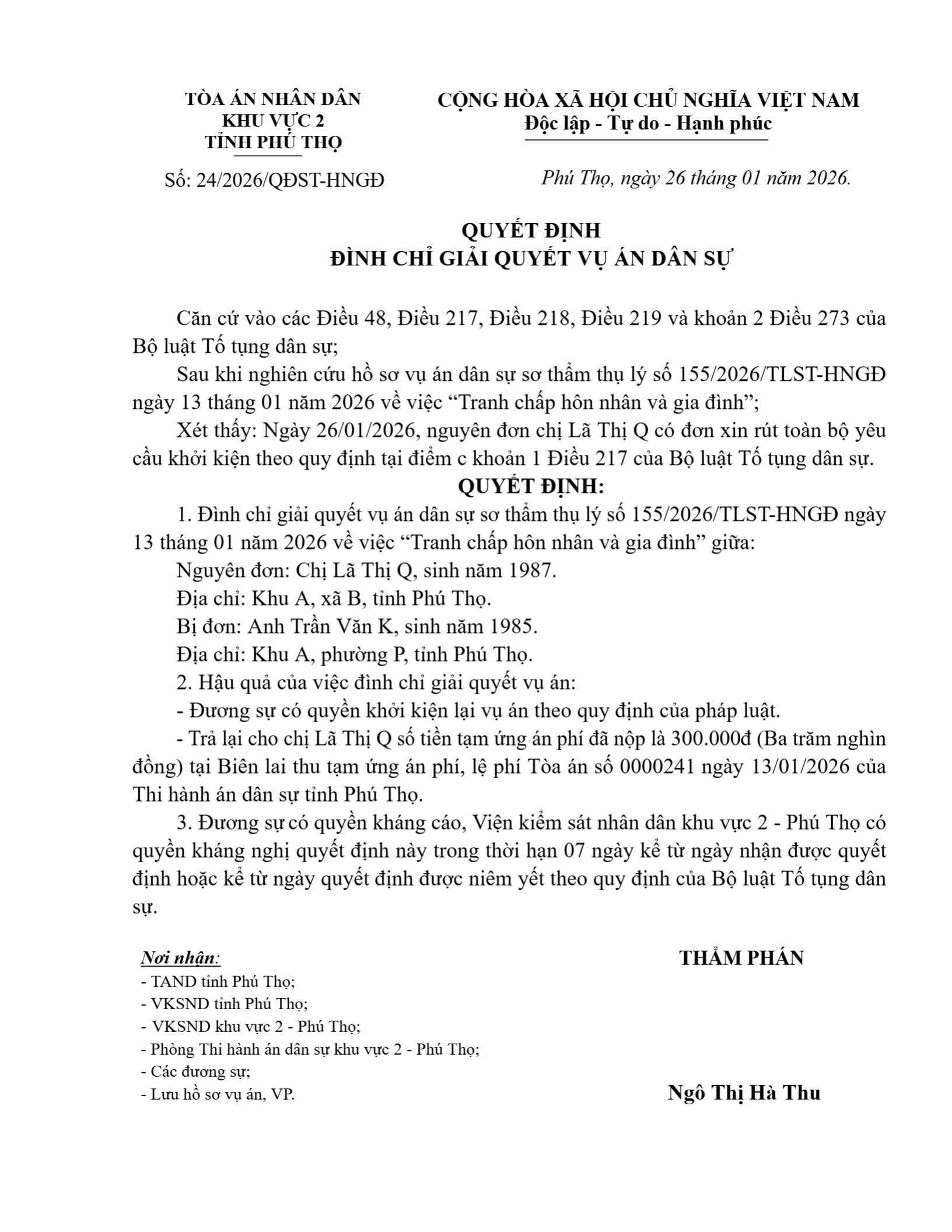 Quyết định số 24/2026/QĐST-HNGĐ ngày 26/01/2026 của Tòa án nhân dân khu vực 2 - Phú Thọ, tỉnh Phú Thọ về vụ án ly hôn về mâu thuẫn gia đình
