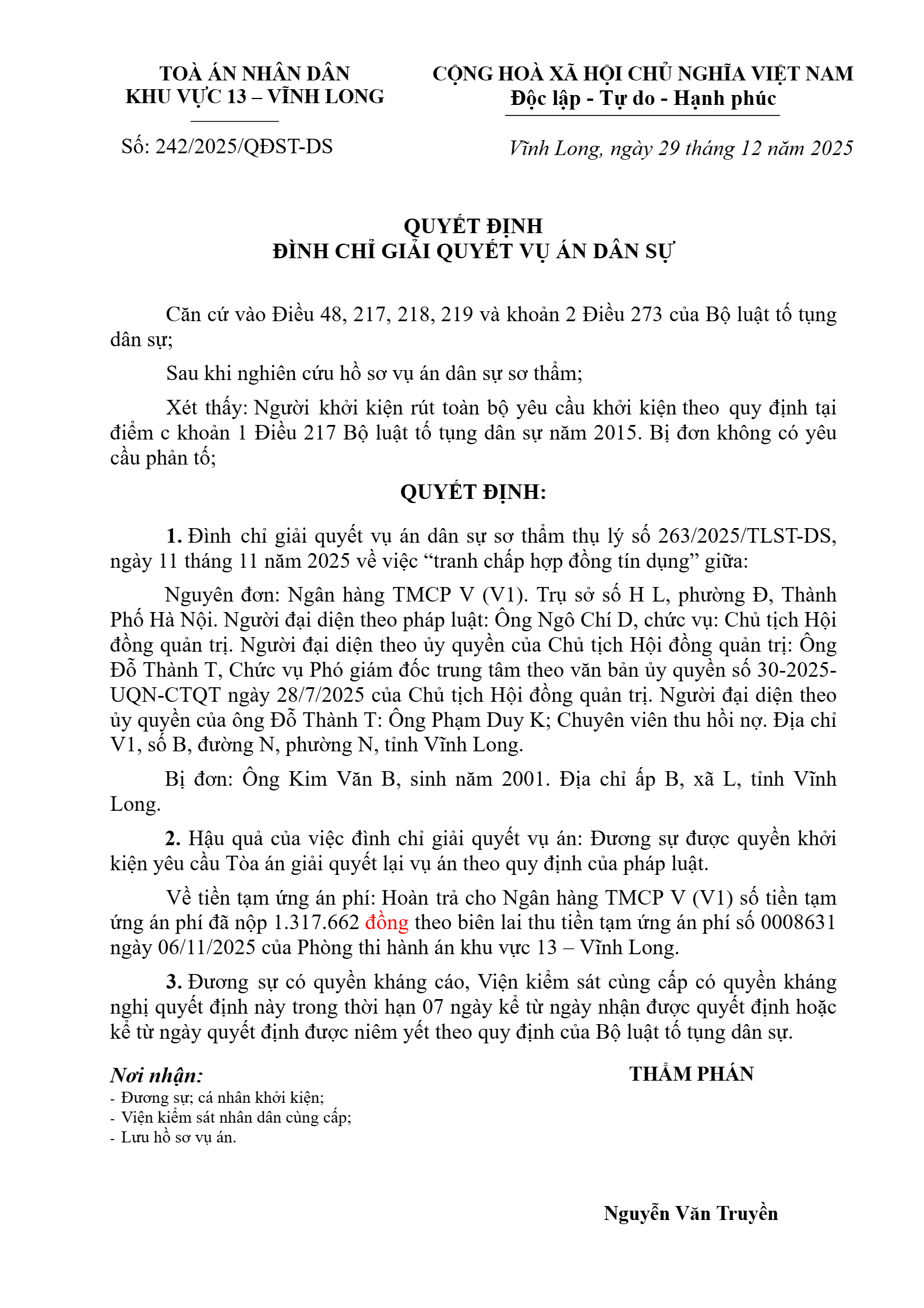 Quyết định số 243/2025/QĐST-DS ngày 29/12/2025 của Tòa án nhân dân khu vực 13 - Vĩnh Long, tỉnh Vĩnh Long về tranh chấp hợp đồng tín dụng