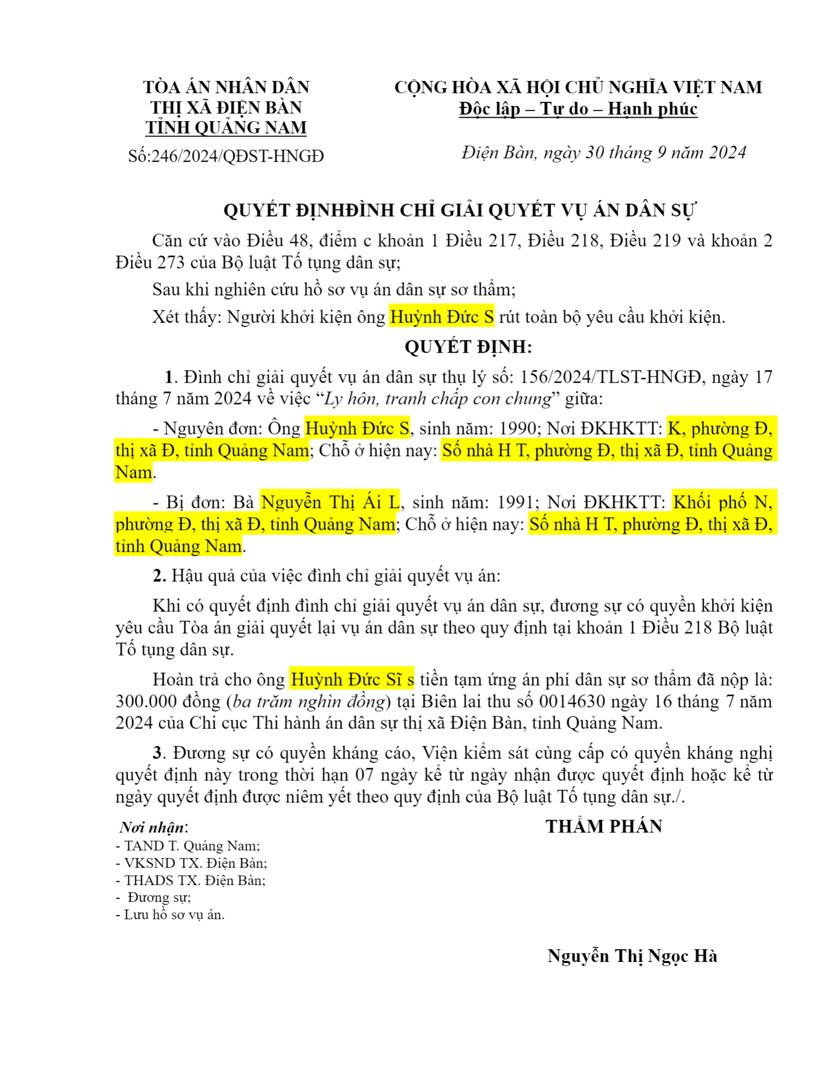 Quyết định số 246/2024/QĐST-HNGĐ ngày 30/09/2024 của TAND TX. Điện Bàn, tỉnh Quảng Nam về vụ án ly hôn về mâu thuẫn gia đình