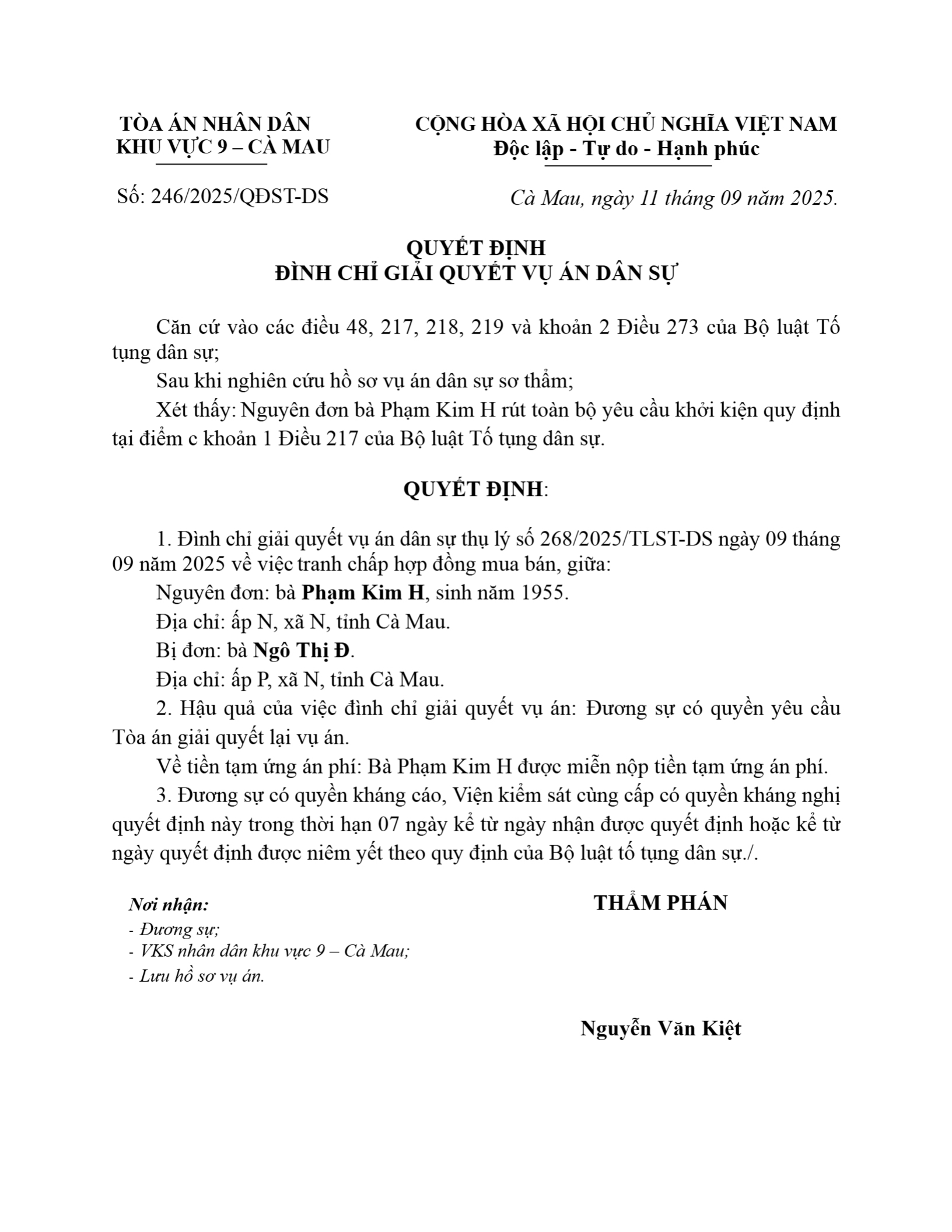 Quyết định số 246/2025/QĐST-DS ngày 11/09/2025 của Tòa án nhân dân khu vực 9 - Cà Mau, tỉnh Cà Mau về tranh chấp về quyền sở hữu và các quyền khác đối với tài sản