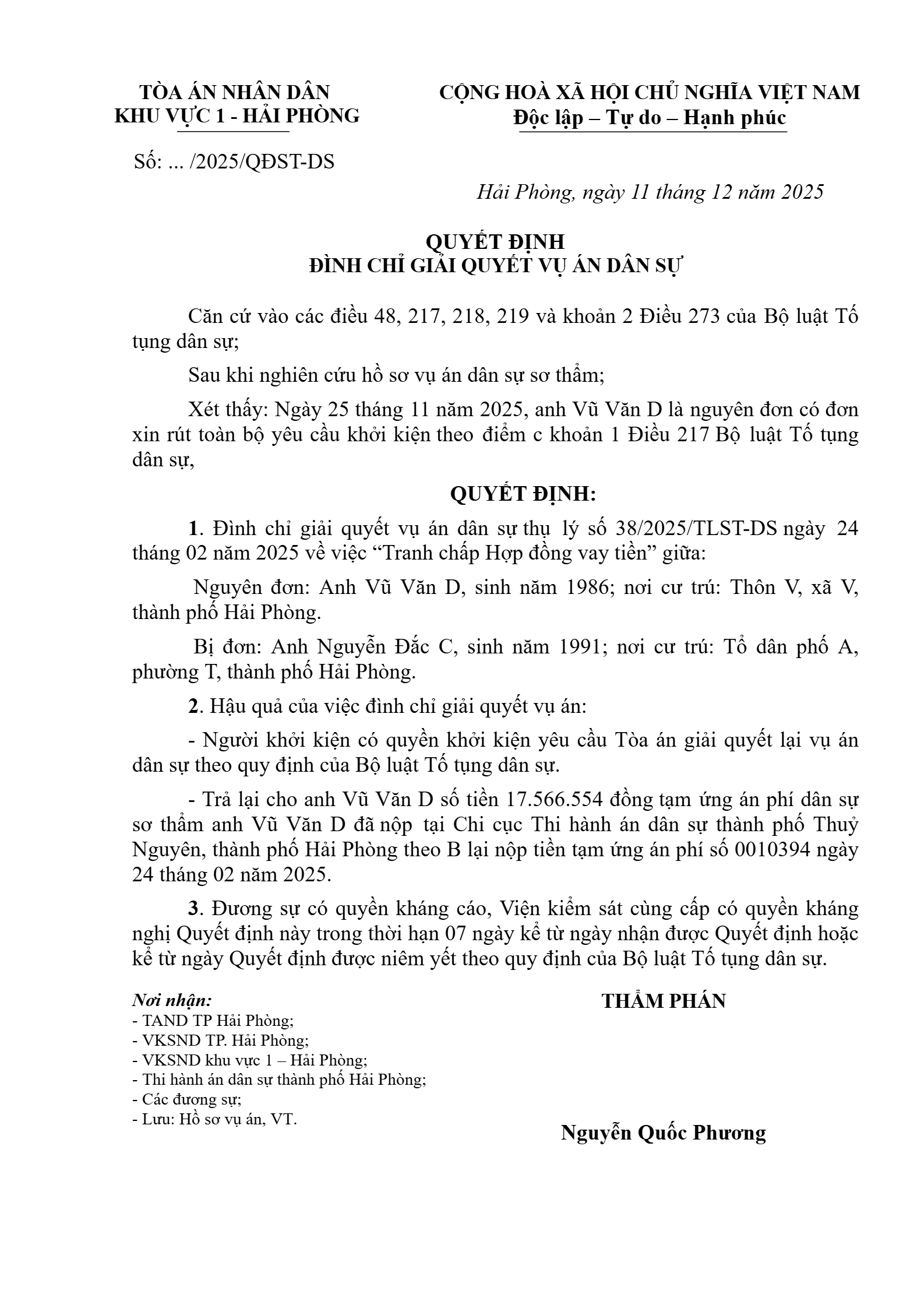 Quyết định số 247/2025/QĐST-DS ngày 11/12/2025 của Tòa án nhân dân khu vực 1 - Hải Phòng, TP. Hải Phòng về tranh chấp hợp đồng vay tài sản