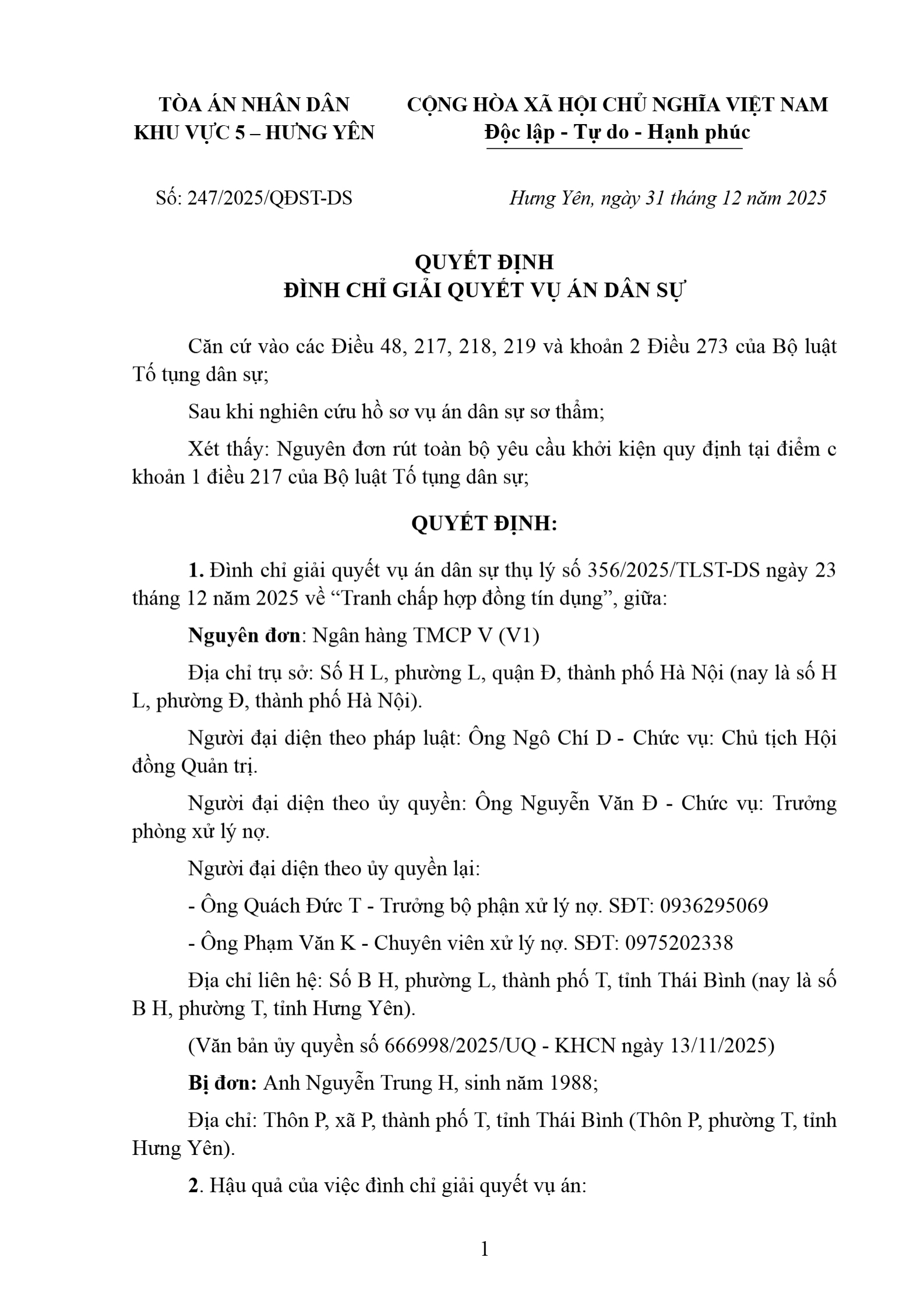 | Thông tin về vụ/việc: | Ngân hàng TV - Nguyễn Trung H |