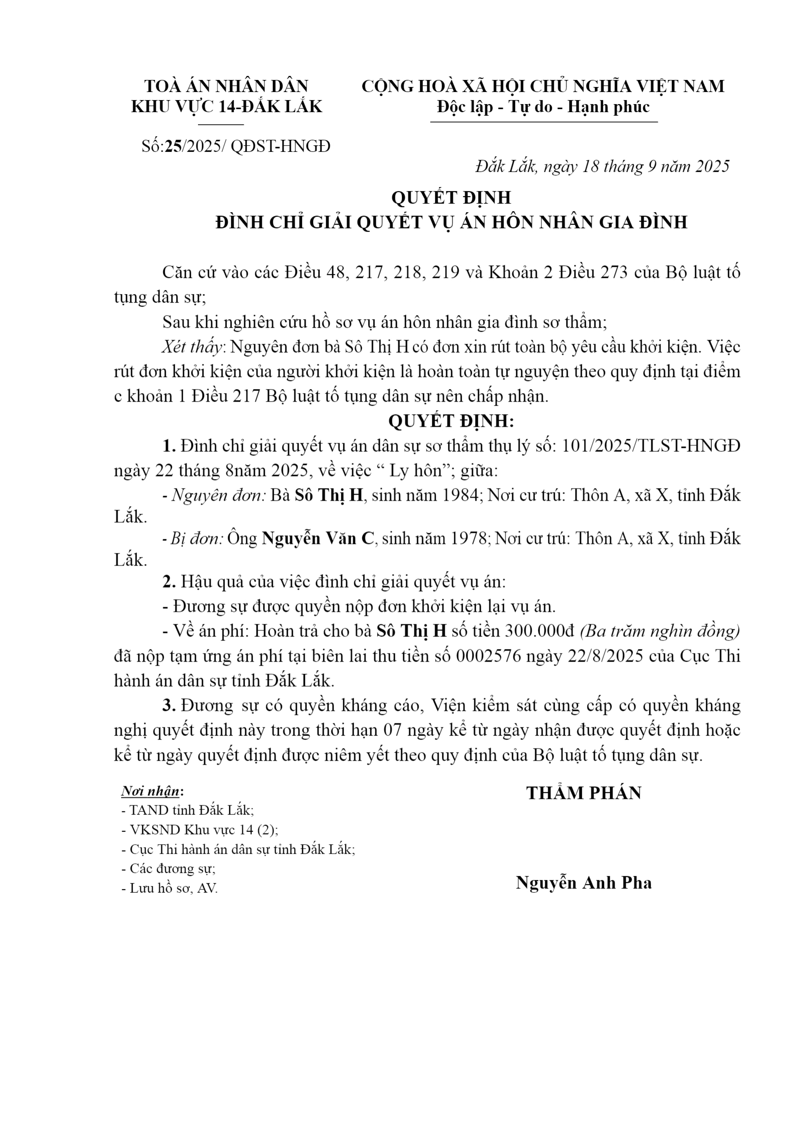 Quyết định số 25/2025/ ngày 18/09/2025 của Tòa án nhân dân khu vực 14 - Đắk Lắk, tỉnh Đắk Lắk về vụ án ly hôn về mâu thuẫn gia đình