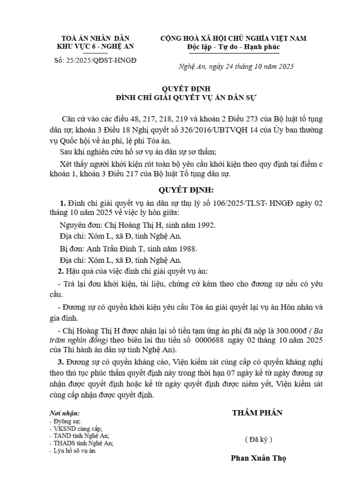 Quyết định số 25/2025 ngày 24/10/2025 của Tòa án nhân dân khu vực 6 - Nghệ An, tỉnh Nghệ An về vụ án ly hôn về mâu thuẫn gia đình