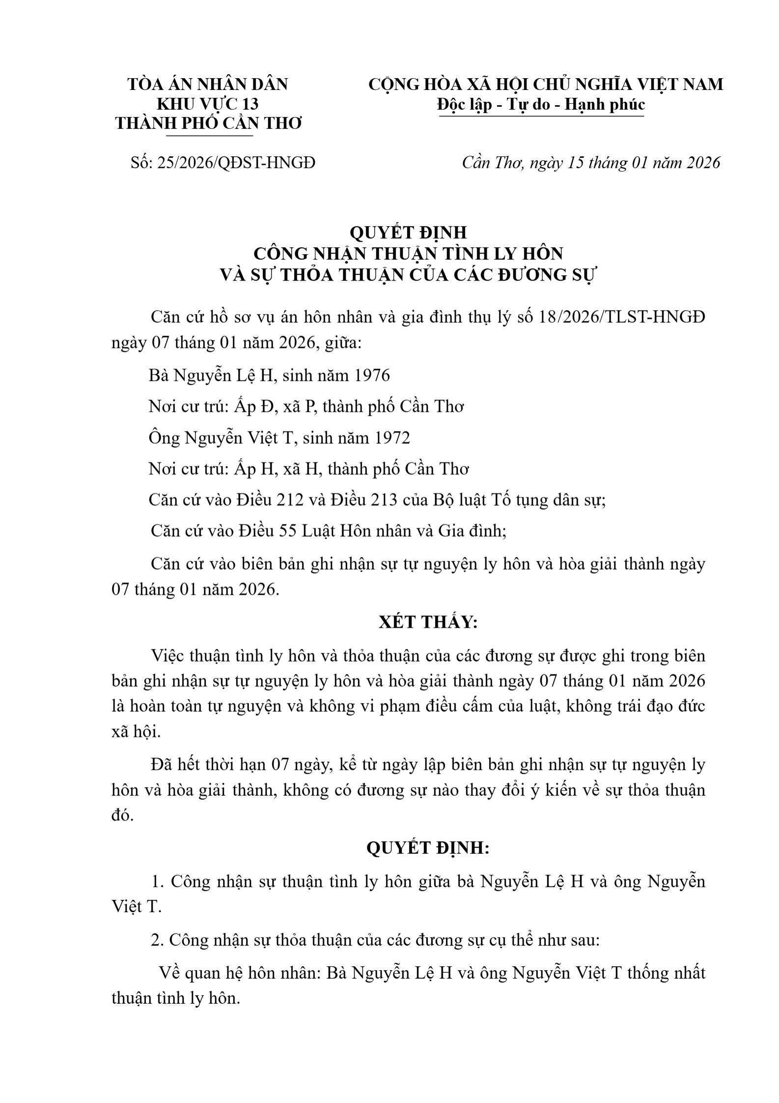 Quyết định số 25/2026/QĐST-HNGĐ ngày 15/01/2026 của Tòa án nhân dân khu vực 13 - Cần Thơ, TP. Cần Thơ về vụ án ly hôn về mâu thuẫn gia đình