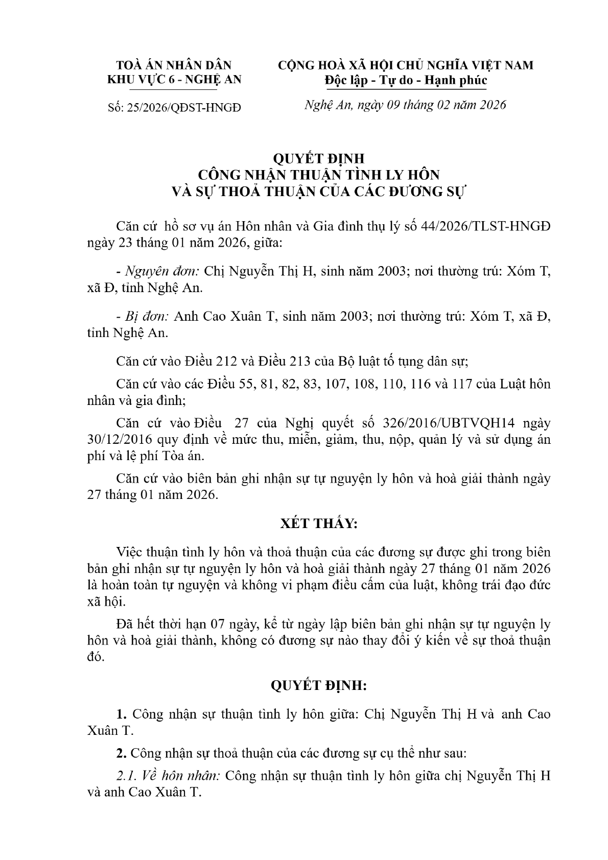Quyết định số 25/2026/QĐST-HNGĐ ngày 09/02/2026 của Tòa án nhân dân khu vực 6 - Nghệ An, tỉnh Nghệ An về vụ án ly hôn về mâu thuẫn gia đình