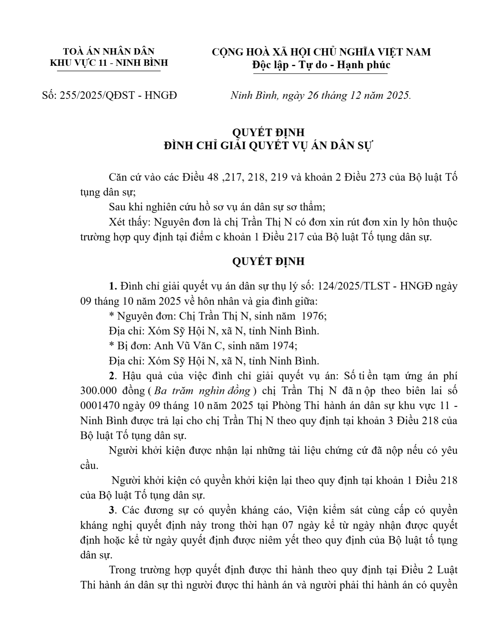 Quyết định số 255/2025/QĐST-HNGĐ ngày 26/12/2025 của Tòa án nhân dân khu vực 11 - Ninh Bình, tỉnh Ninh Bình về vụ án ly hôn về mâu thuẫn gia đình