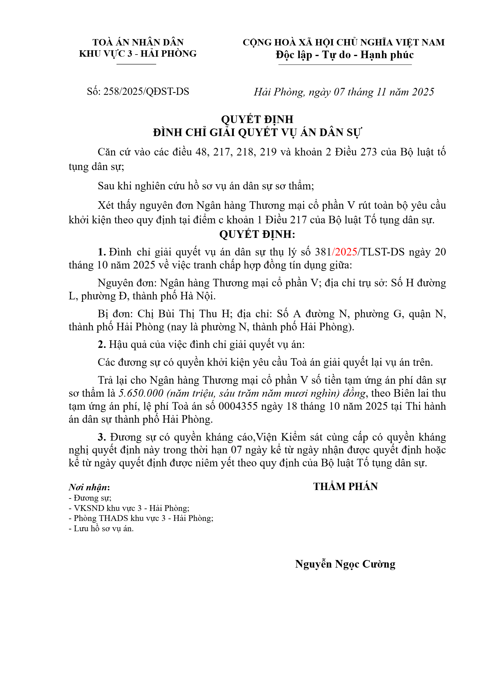 Quyết định số 258/2025/QĐST-DS ngày 07/11/2025 của Tòa án nhân dân khu vực 3 - Hải Phòng, TP. Hải Phòng về tranh chấp hợp đồng tín dụng