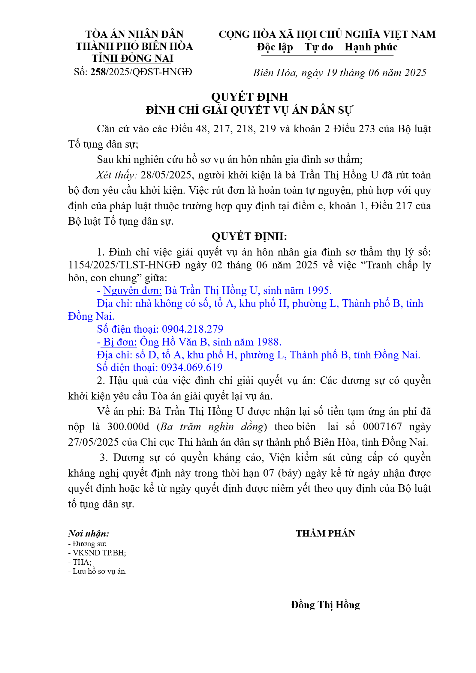 Quyết định số 258/2025/QĐST-HNGĐ ngày 19/06/2025 của TAND TP. Biên Hòa, tỉnh Đồng Nai về vụ án ly hôn về mâu thuẫn gia đình