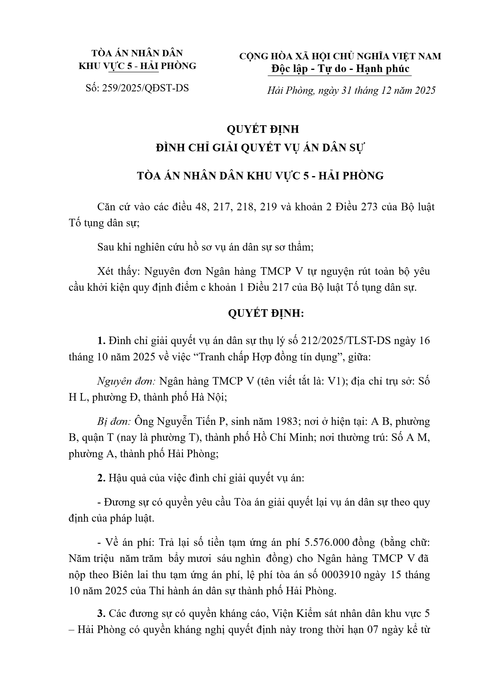 Quyết định số 259/2025/QĐST-DS ngày 31/12/2025 của Tòa án nhân dân khu vực 5 - Hải Phòng, TP. Hải Phòng về tranh chấp hợp đồng tín dụng