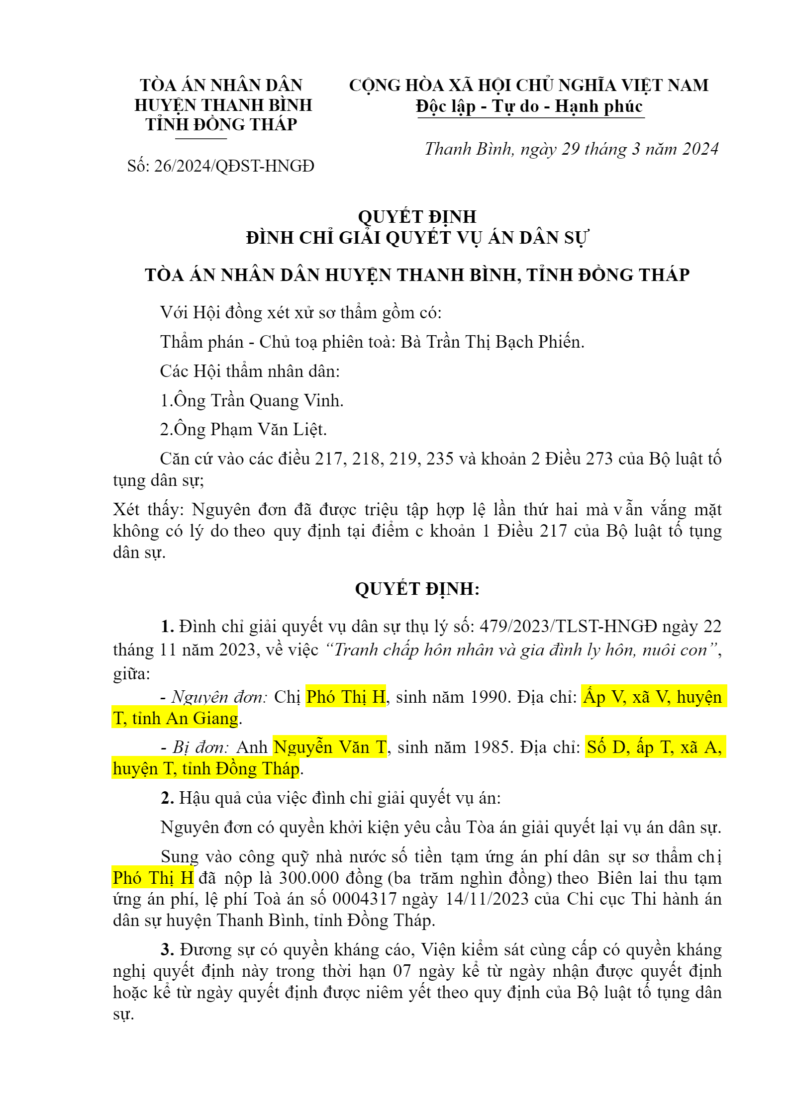 | Tòa án xét xử: | TAND huyện Thanh Bình (TAND tỉnh Đồng Tháp) |