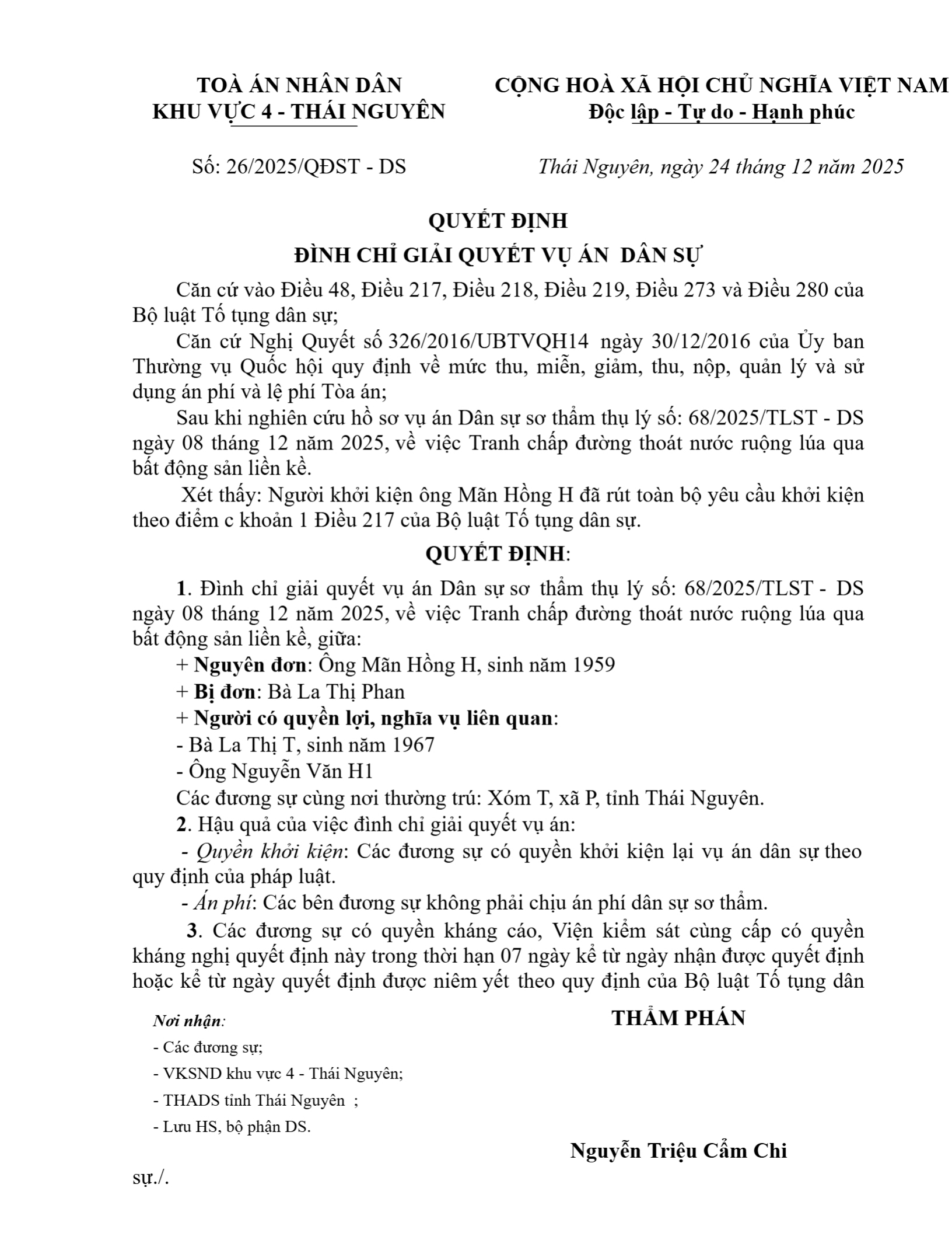 Quyết định số 26/2025/QĐST ngày 24/12/2025 của Tòa án nhân dân khu vực 4 - Thái Nguyên, tỉnh Thái Nguyên về tranh chấp quyền sử dụng đất