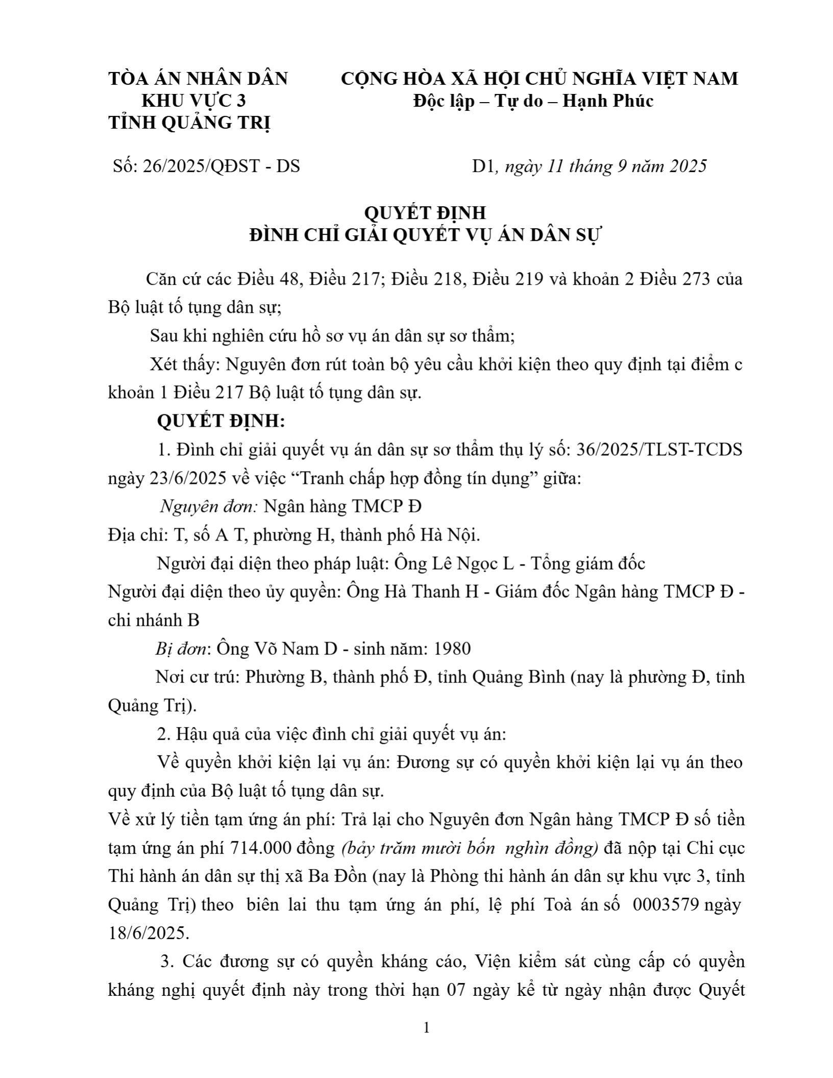 Quyết định số 26/2025/QĐST-DS ngày 11/09/2025 của Tòa án nhân dân khu vực 3 - Quảng Trị, tỉnh Quảng Trị về tranh chấp hợp đồng tín dụng