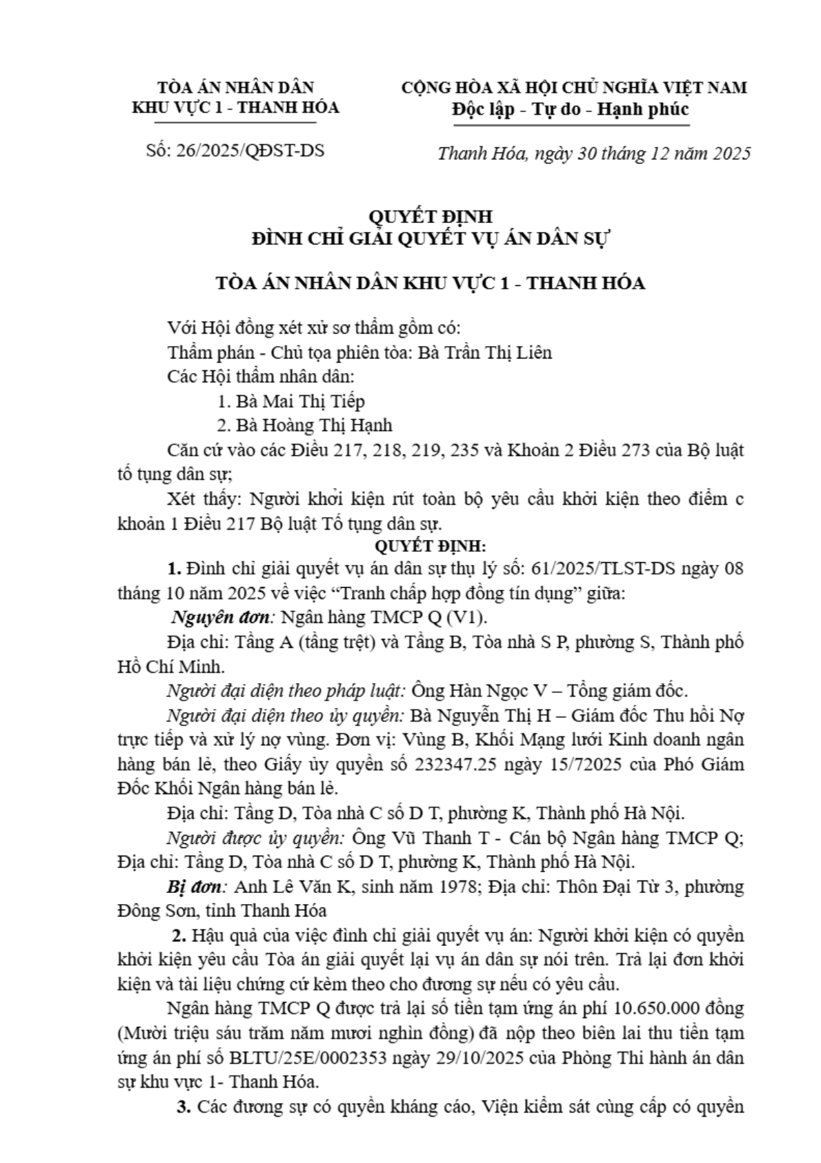 Quyết định số 26/2025/QĐST-DS ngày 30/12/2025 của Tòa án nhân dân khu vực 1 - Thanh Hóa, tỉnh Thanh Hóa về tranh chấp hợp đồng tín dụng