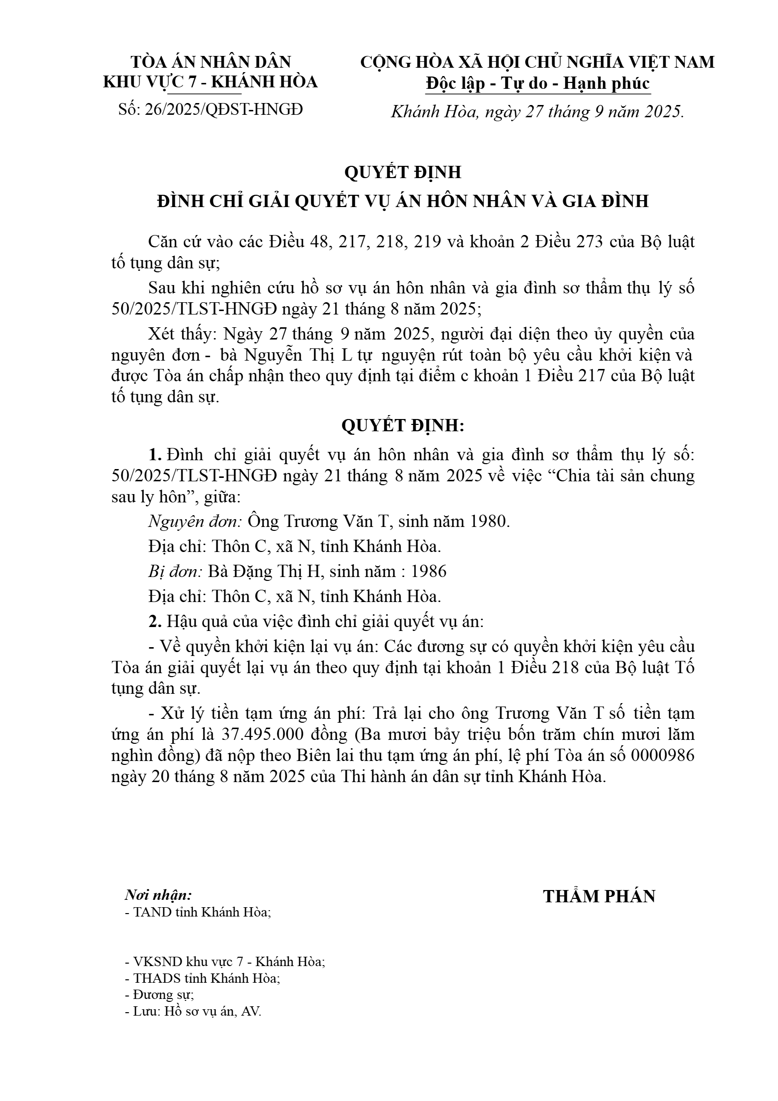 Quyết định số 26/2025/QĐST-HNGĐ ngày 27/09/2025 của Tòa án nhân dân khu vực 7 - Khánh Hòa, tỉnh Khánh Hòa về tranh chấp về chia tài sản khi ly hôn