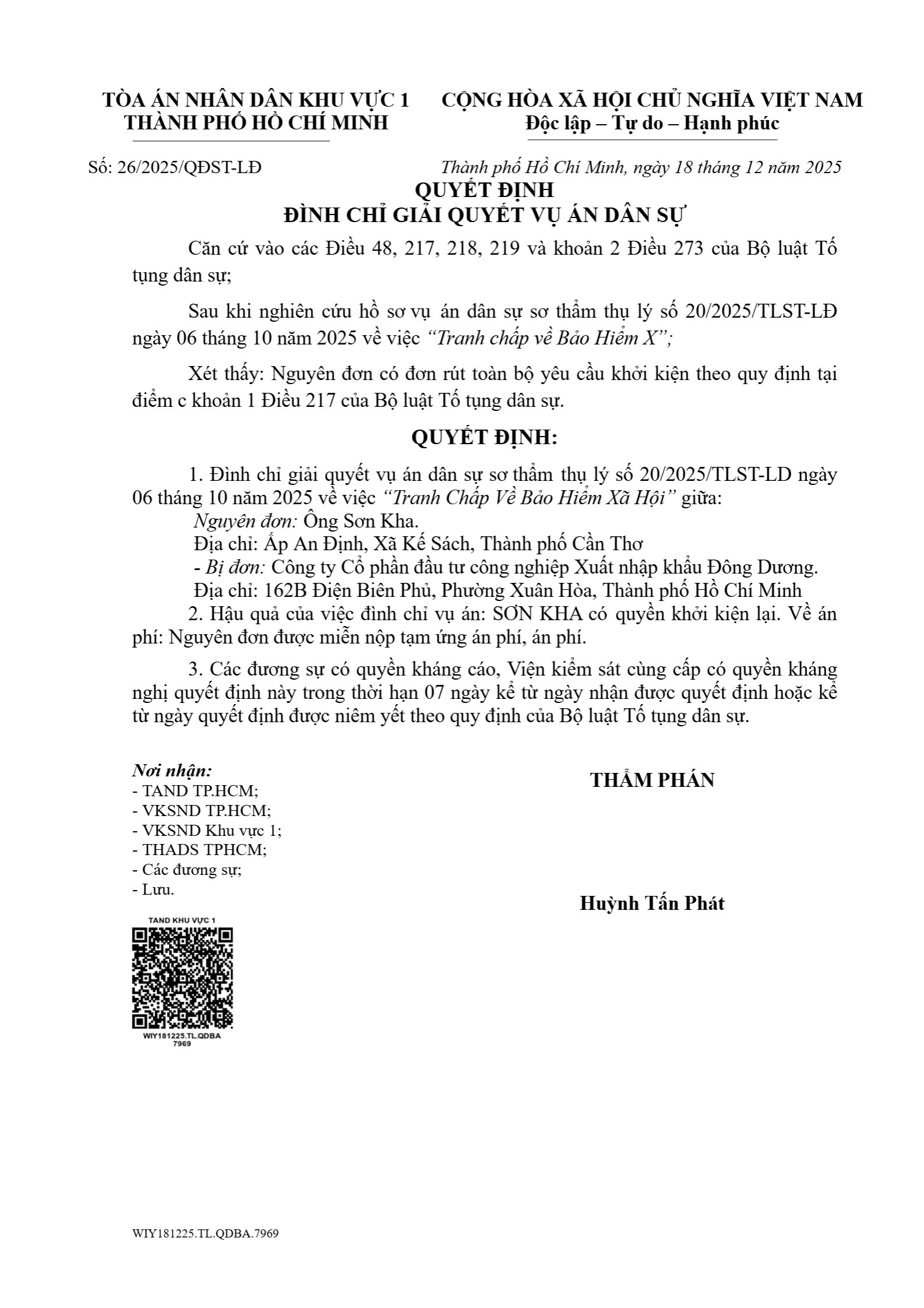 Quyết định số 26/2025/QĐST-LĐ ngày 18/12/2025 của Tòa án nhân dân khu vực 1 - Hồ Chí Minh, TP. Hồ Chí Minh về tranh chấp về bảo hiểm xã hội, bảo hiểm y tế, bảo hiểm thất nghiệp, bảo hiểm tai nạn lao động, bệnh nghề nghiệp