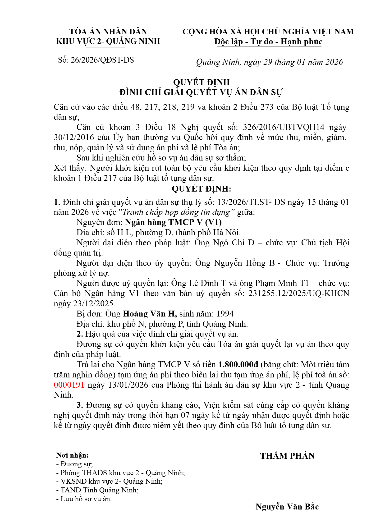 Quyết định số 26/2026/QĐST-DS ngày 29/01/2026 của Tòa án nhân dân khu vực 2 - Quảng Ninh, tỉnh Quảng Ninh về tranh chấp hợp đồng tín dụng