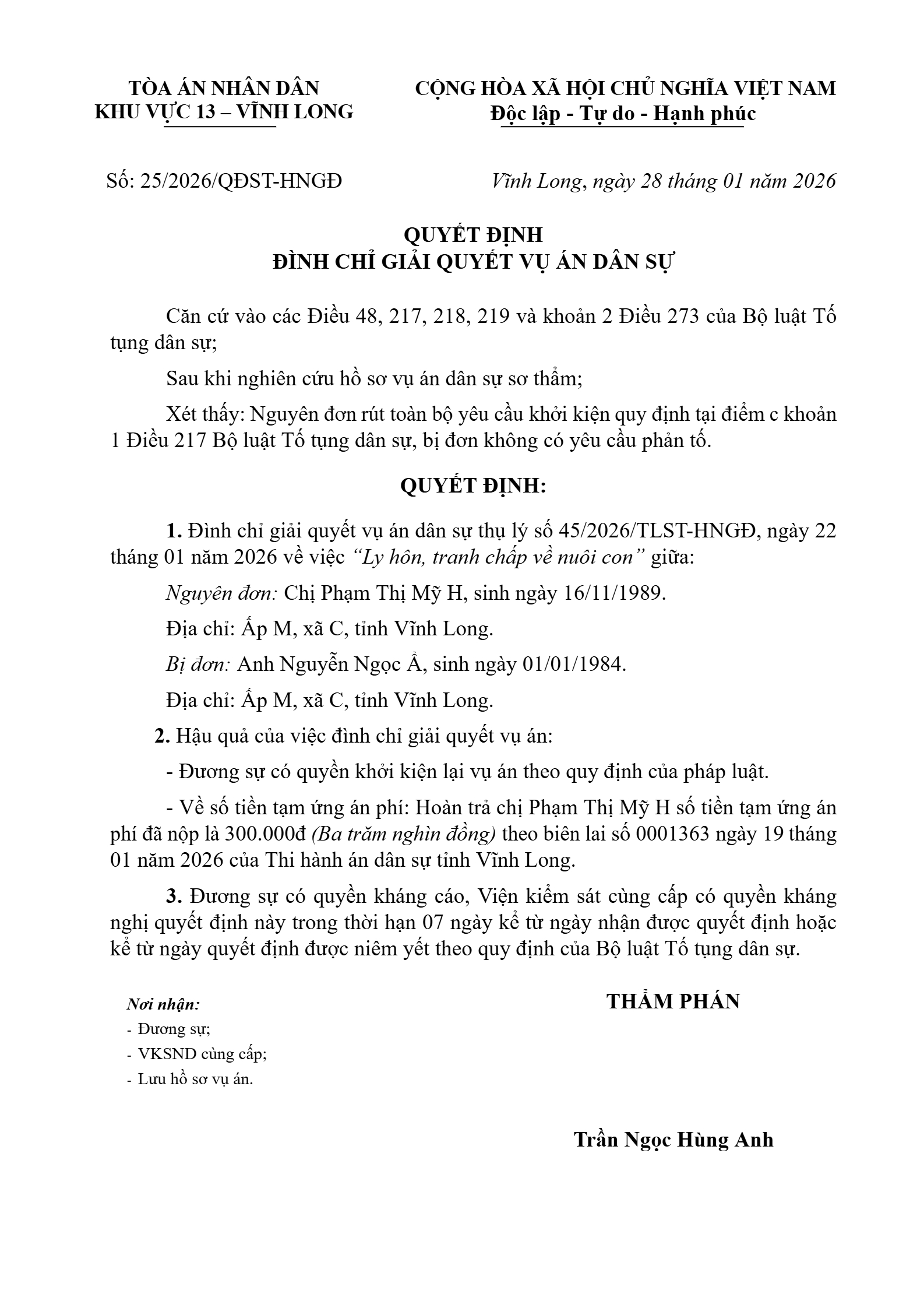 Quyết định số 26/2026/QĐST-HNGĐ ngày 26/01/2026 của Tòa án nhân dân khu vực 13 - Vĩnh Long, tỉnh Vĩnh Long về vụ án ly hôn về mâu thuẫn gia đình