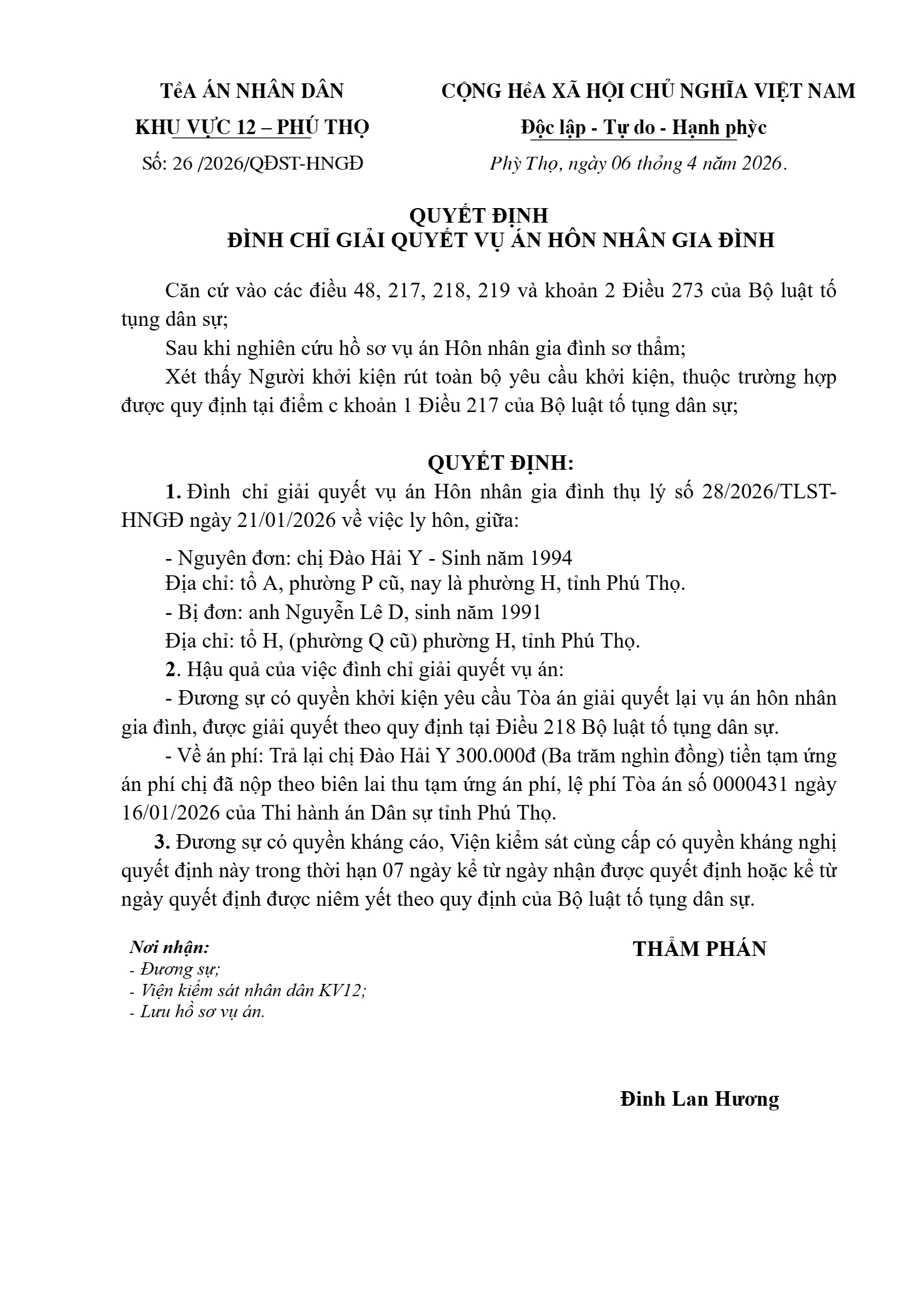 Quyết định số 26/2026/QĐST-HNGĐ ngày 06/04/2026 của Tòa án nhân dân khu vực 12 - Phú Thọ, tỉnh Phú Thọ về vụ án ly hôn về mâu thuẫn gia đình