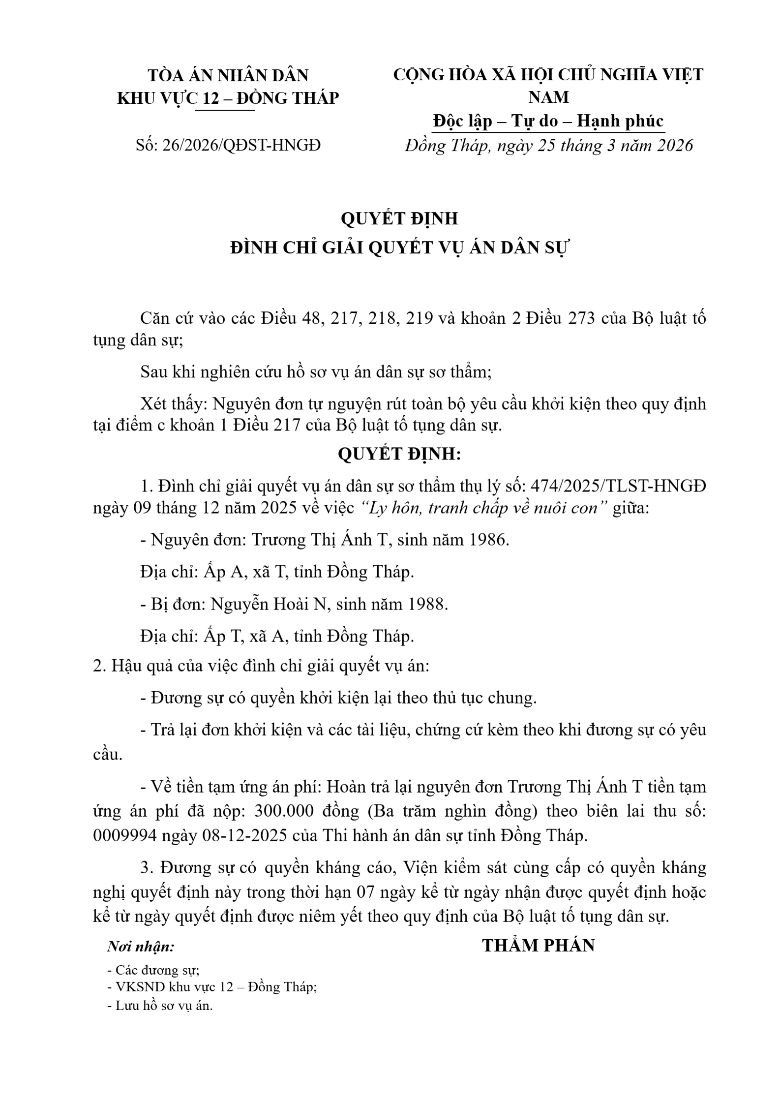 Quyết định số 26/2026/QĐST-HNGĐ ngày 25/03/2026 của Tòa án nhân dân khu vực 12 - Đồng Tháp, tỉnh Đồng Tháp về vụ án ly hôn về mâu thuẫn gia đình