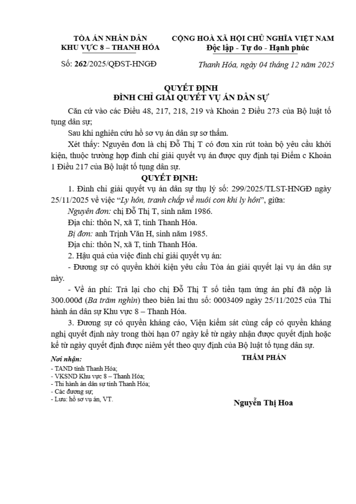 Quyết định số 262/2025/QĐST-HNGĐ ngày 04/12/2025 của Tòa án nhân dân khu vực 8 - Thanh Hóa, tỉnh Thanh Hóa về vụ án ly hôn về mâu thuẫn gia đình