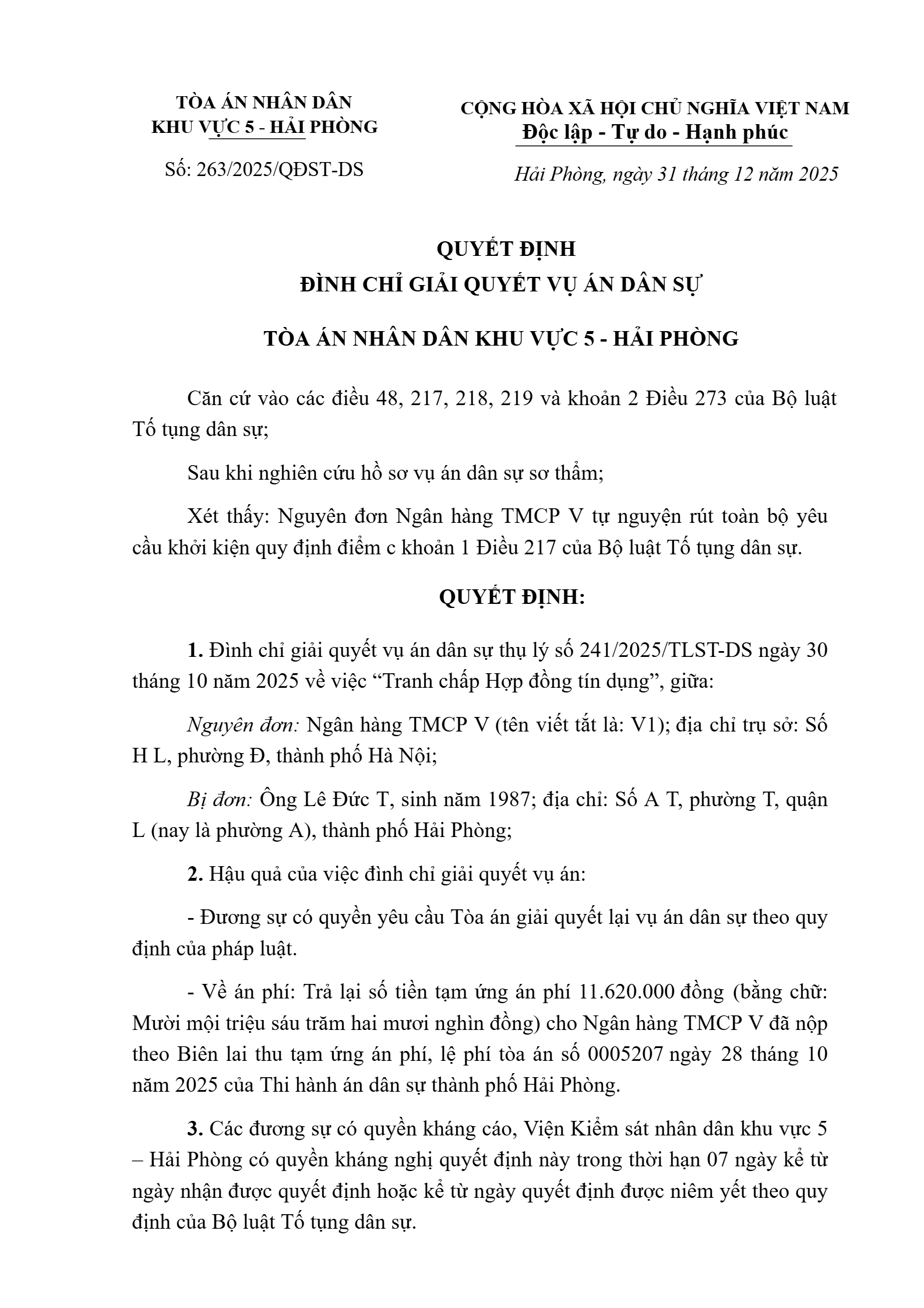Quyết định số 263/2025/QĐST-DS ngày 31/12/2025 của Tòa án nhân dân khu vực 5 - Hải Phòng, TP. Hải Phòng về tranh chấp hợp đồng tín dụng