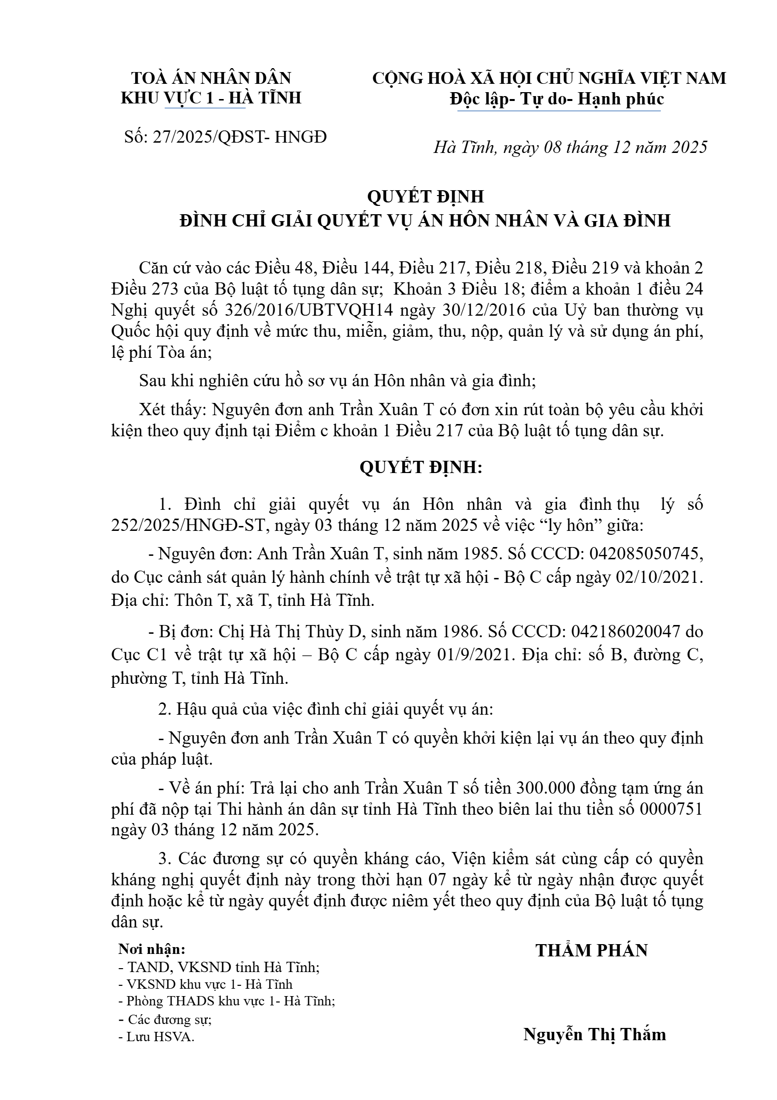 Quyết định số 27/2025/QĐST- ngày 09/12/2025 của Tòa án nhân dân khu vực 1 - Hà Tĩnh, tỉnh Hà Tĩnh về vụ án ly hôn về mâu thuẫn gia đình