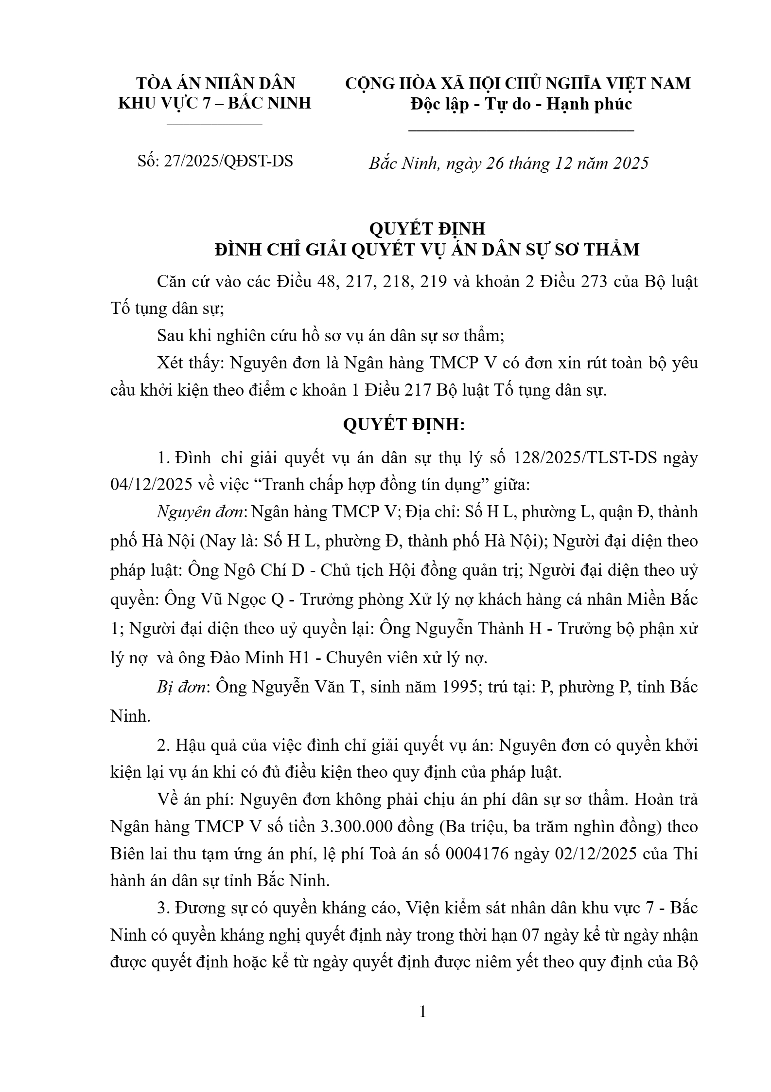 Quyết định số 27/2025/QĐST-DS ngày 26/12/2025 của Tòa án nhân dân khu vực 7 - Bắc Ninh, tỉnh Bắc Ninh về tranh chấp hợp đồng tín dụng