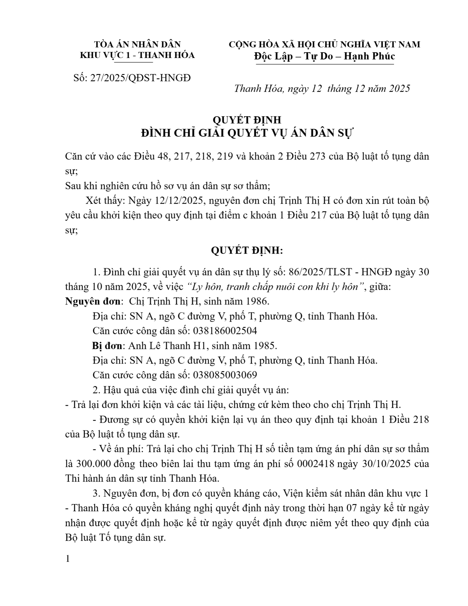 Quyết định số 27/2025/QĐST-HNGĐ ngày 12/12/2025 của Tòa án nhân dân khu vực 1 - Thanh Hóa, tỉnh Thanh Hóa về vụ án ly hôn về mâu thuẫn gia đình