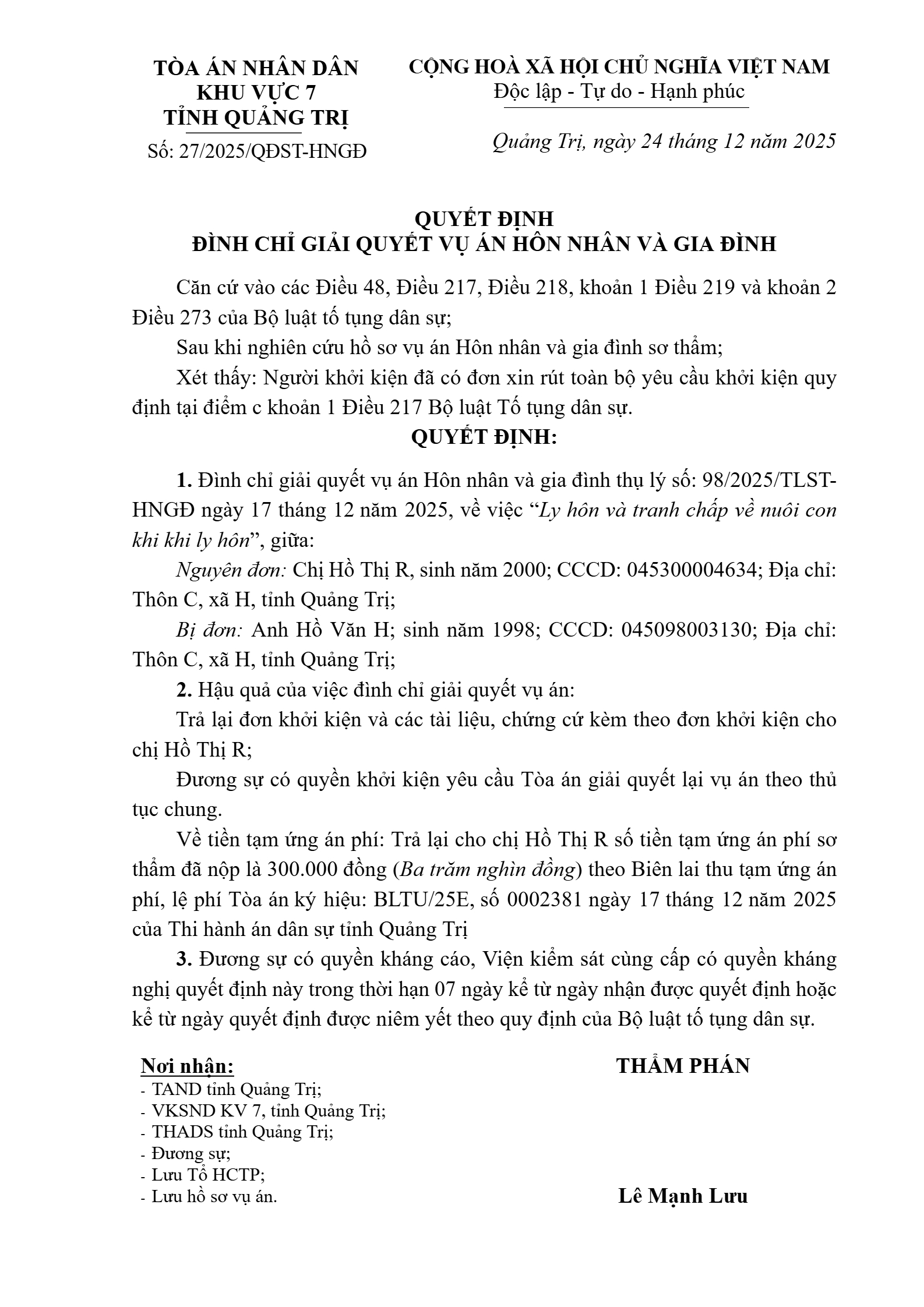 Quyết định số 27/2025/QĐST-HNGĐ ngày 24/12/2025 của Tòa án nhân dân khu vực 7 - Quảng Trị, tỉnh Quảng Trị về vụ án ly hôn về mâu thuẫn gia đình