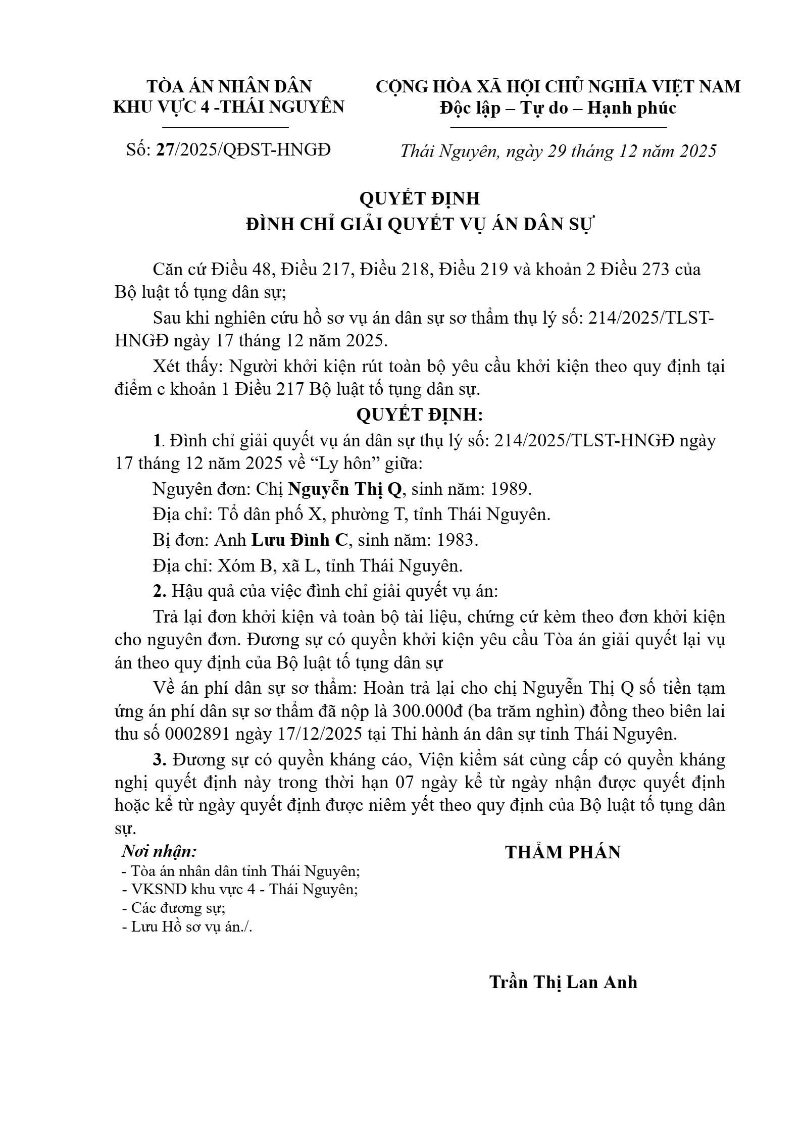 Quyết định số 27/2025/QĐST-HNGĐ ngày 29/12/2025 của Tòa án nhân dân khu vực 4 - Thái Nguyên, tỉnh Thái Nguyên về vụ án ly hôn về mâu thuẫn gia đình