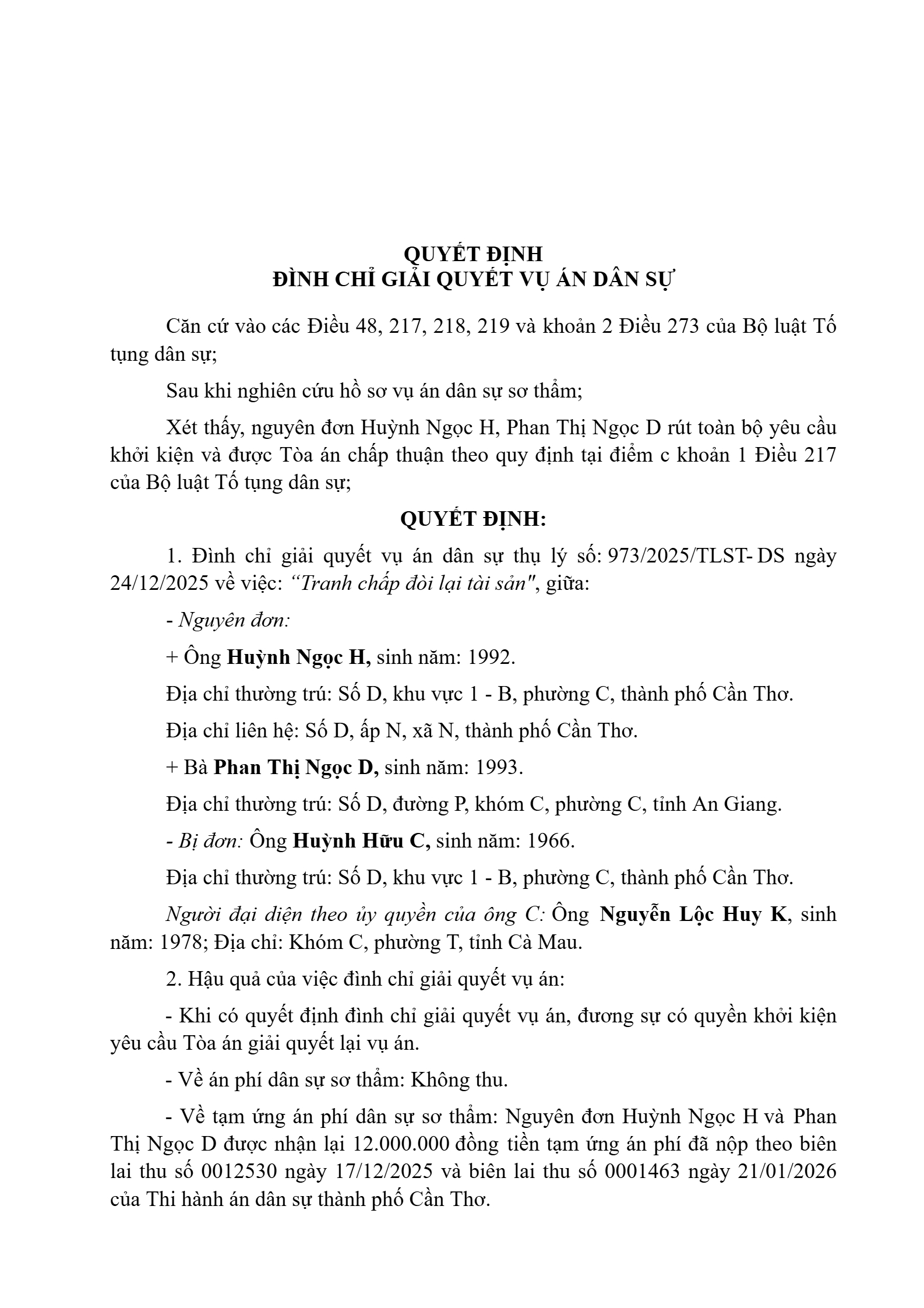 Quyết định số 27/2026/QĐST-DS ngày 15/02/2026 của Tòa án nhân dân khu vực 3 - Cần Thơ, TP. Cần Thơ về tranh chấp hợp đồng mượn tài sản