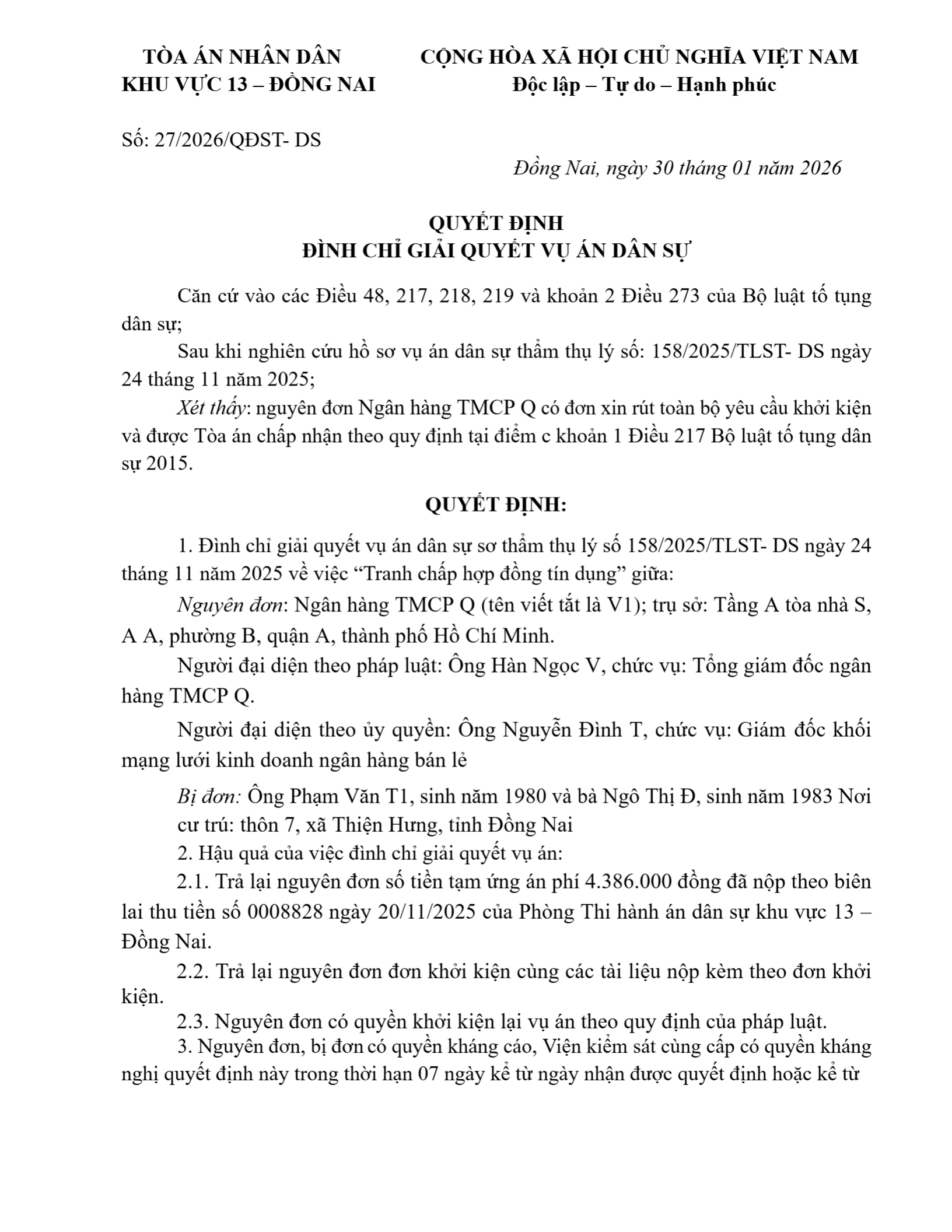 Quyết định số 27/2026/QĐST-DS