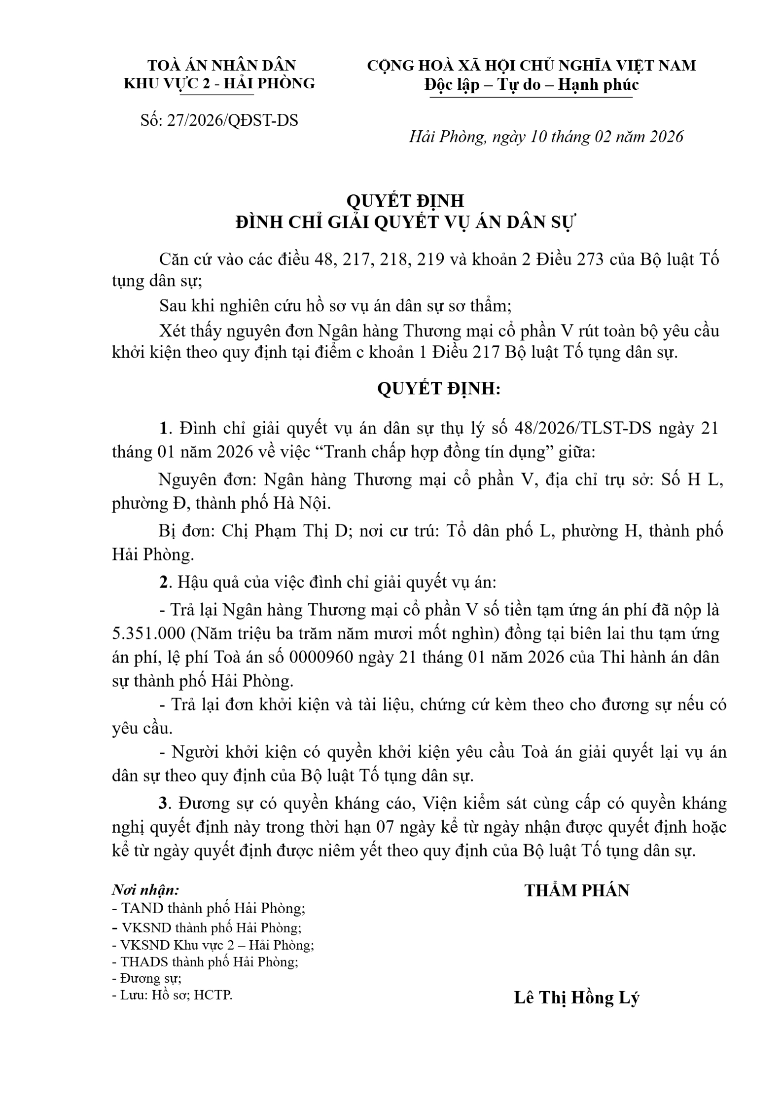 Quyết định số 27/2026/QĐST-DS ngày 10/02/2026 của Tòa án nhân dân khu vực 2 - Hải Phòng, TP. Hải Phòng về tranh chấp hợp đồng tín dụng