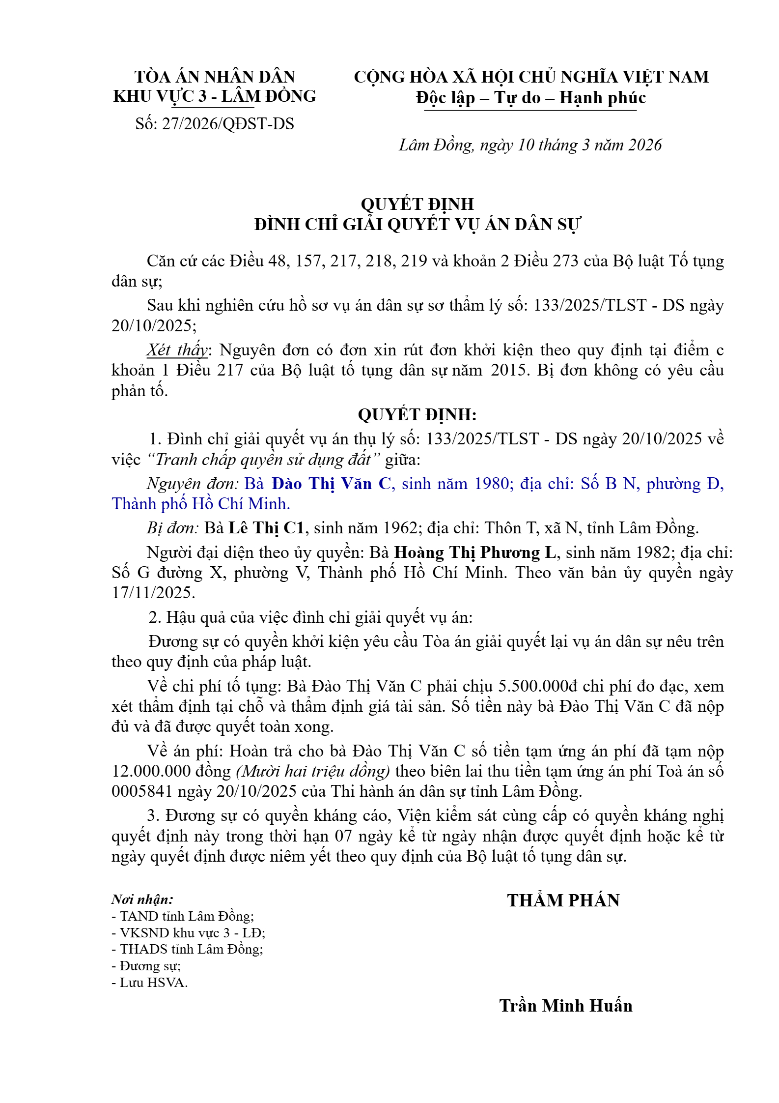 Quyết định số 27/2026/QĐST-DS ngày 10/03/2026 của Tòa án nhân dân khu vực 3 - Lâm Đồng, tỉnh Lâm Đồng về tranh chấp đất đai