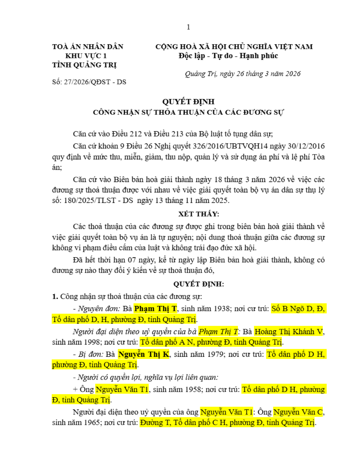 | Tên Quyết định: | Quyết định số 27/2026/QĐST-DS ngày 26/03/2026 của Tòa án nhân dân khu vực 1 - Quảng Trị, tỉnh Quảng Trị về tranh chấp về thừa kế tài sản |