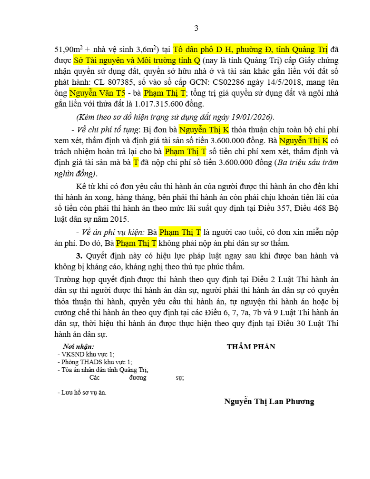 | Thông tin về vụ/việc: | QĐCNTTĐS Phạm Thị T - Nguyễn Thị K |