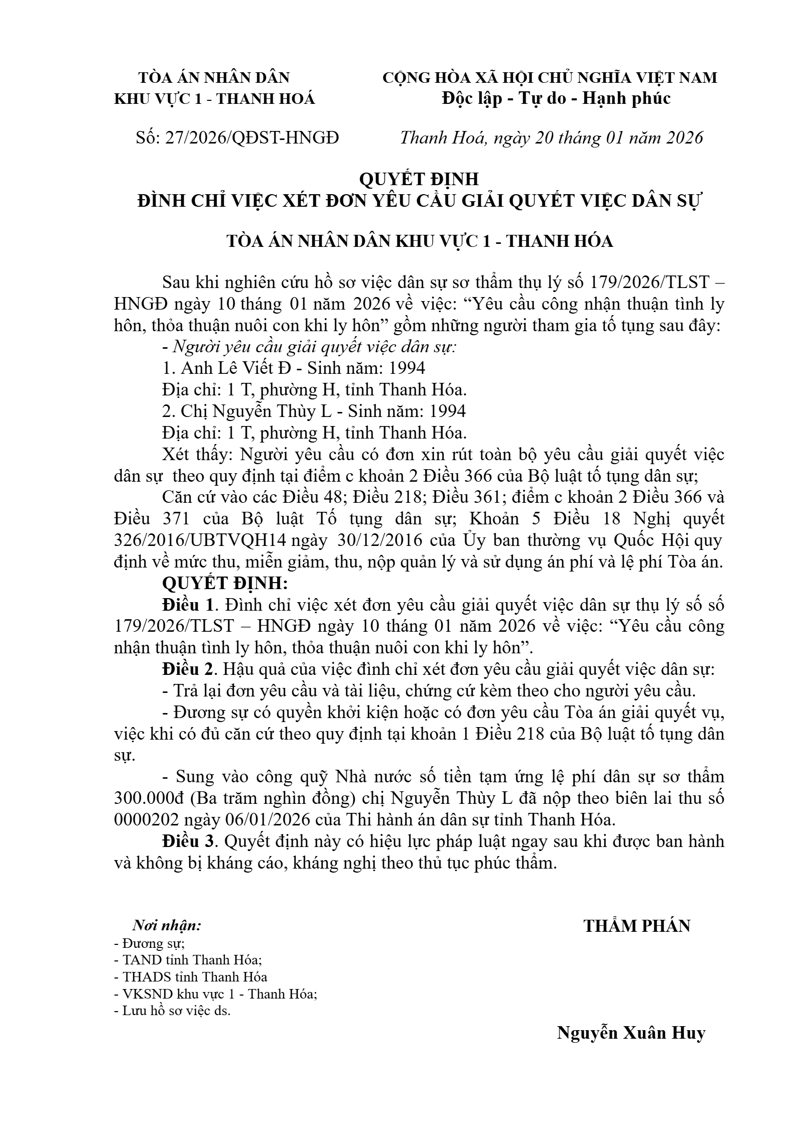 Quyết định số 27/2026/QĐST-HNGĐ ngày 20/01/2026 của Tòa án nhân dân khu vực 1 - Thanh Hóa, tỉnh Thanh Hóa về yêu cầu công nhận thuận tình ly hôn
