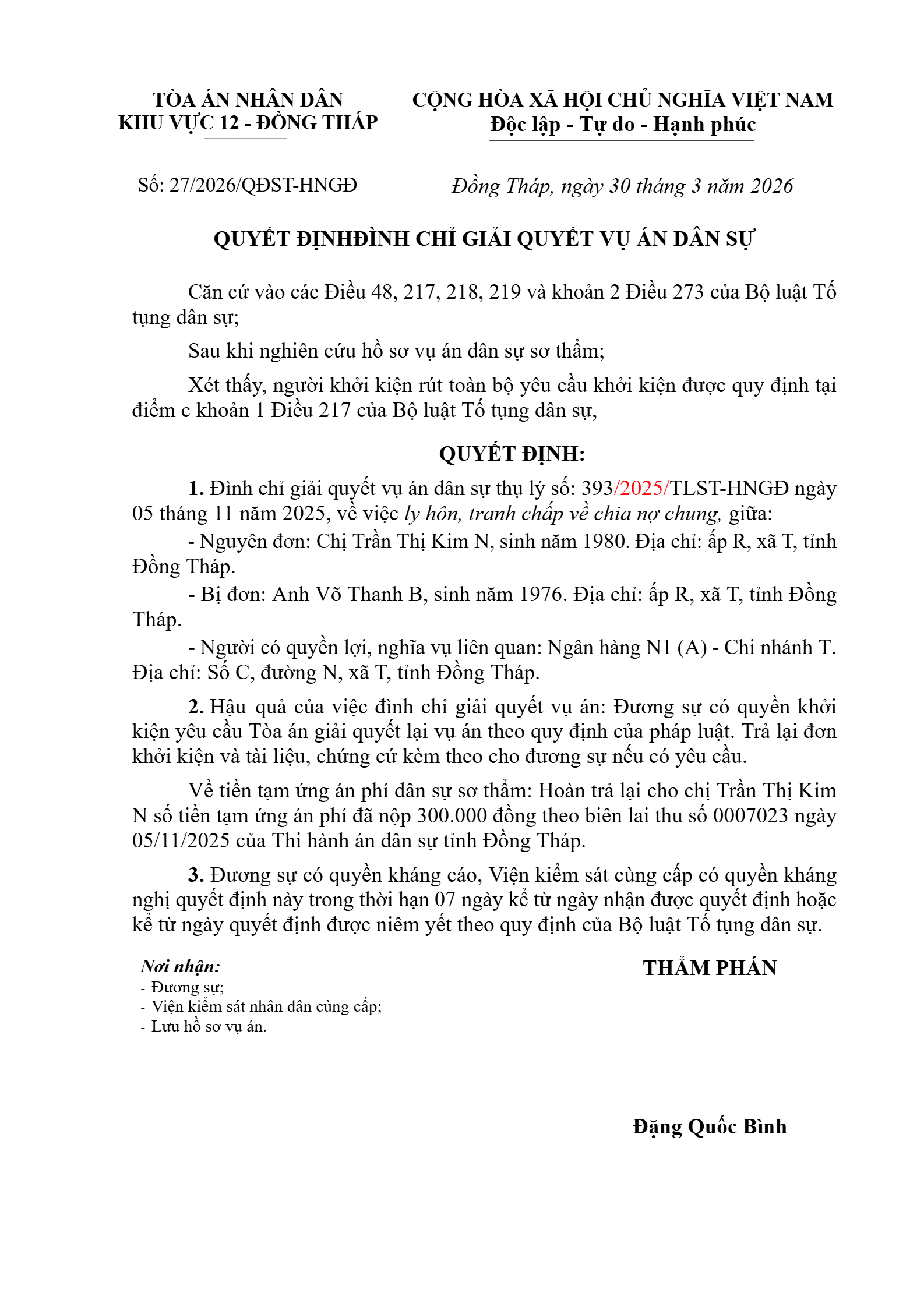 Quyết định số 27/2026/QĐST-HNGĐ ngày 30/03/2026 của Tòa án nhân dân khu vực 12 - Đồng Tháp, tỉnh Đồng Tháp về vụ án ly hôn về mâu thuẫn gia đình
