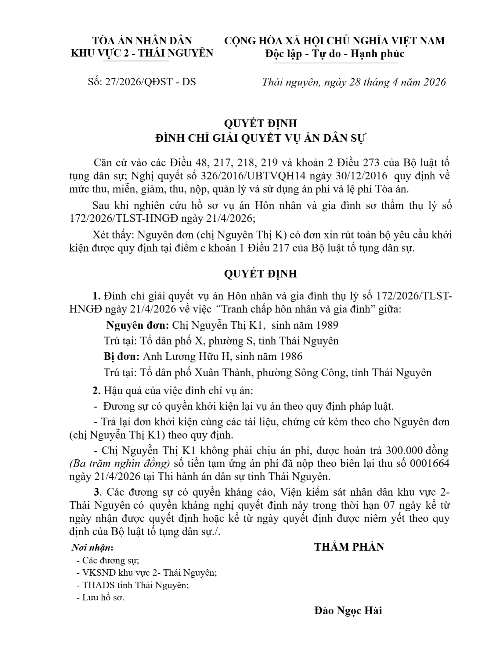 Quyết định số 27/2026/QĐST-HNGĐ ngày 28/04/2026 của Tòa án nhân dân khu vực 2 - Thái Nguyên, tỉnh Thái Nguyên về vụ án ly hôn về mâu thuẫn gia đình