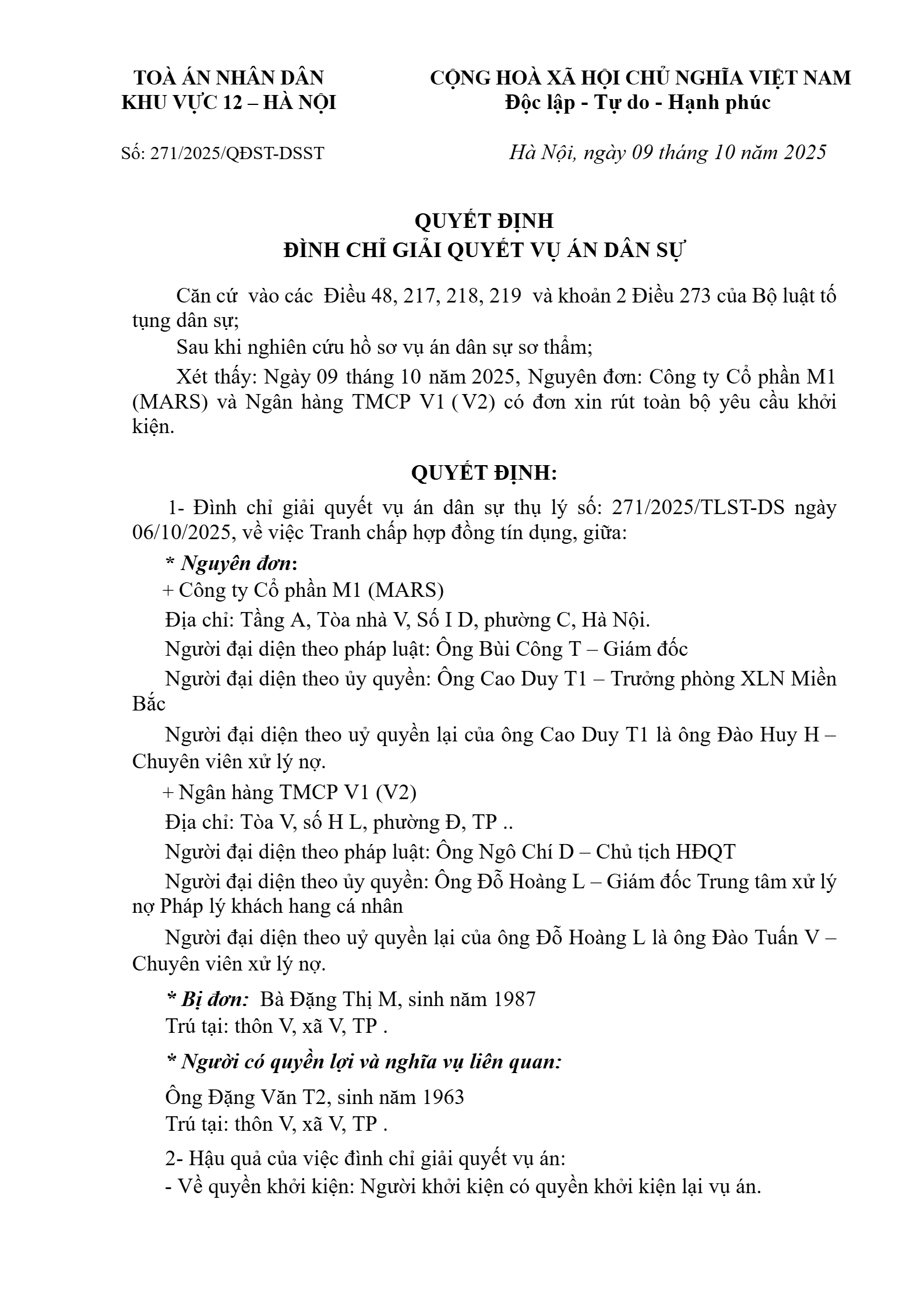 Quyết định số 271/2025/QĐST-DS ngày 09/10/2025 của Tòa án nhân dân khu vực 12 - Hà Nội, TP. Hà Nội về tranh chấp hợp đồng tín dụng