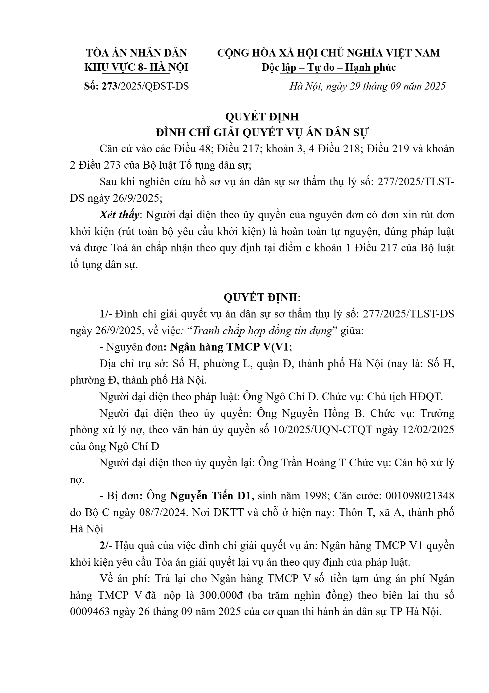 Quyết định số 273/2025/QĐST-DS ngày 29/09/2025 của Tòa án nhân dân khu vực 8 - Hà Nội, TP. Hà Nội về tranh chấp hợp đồng tín dụng