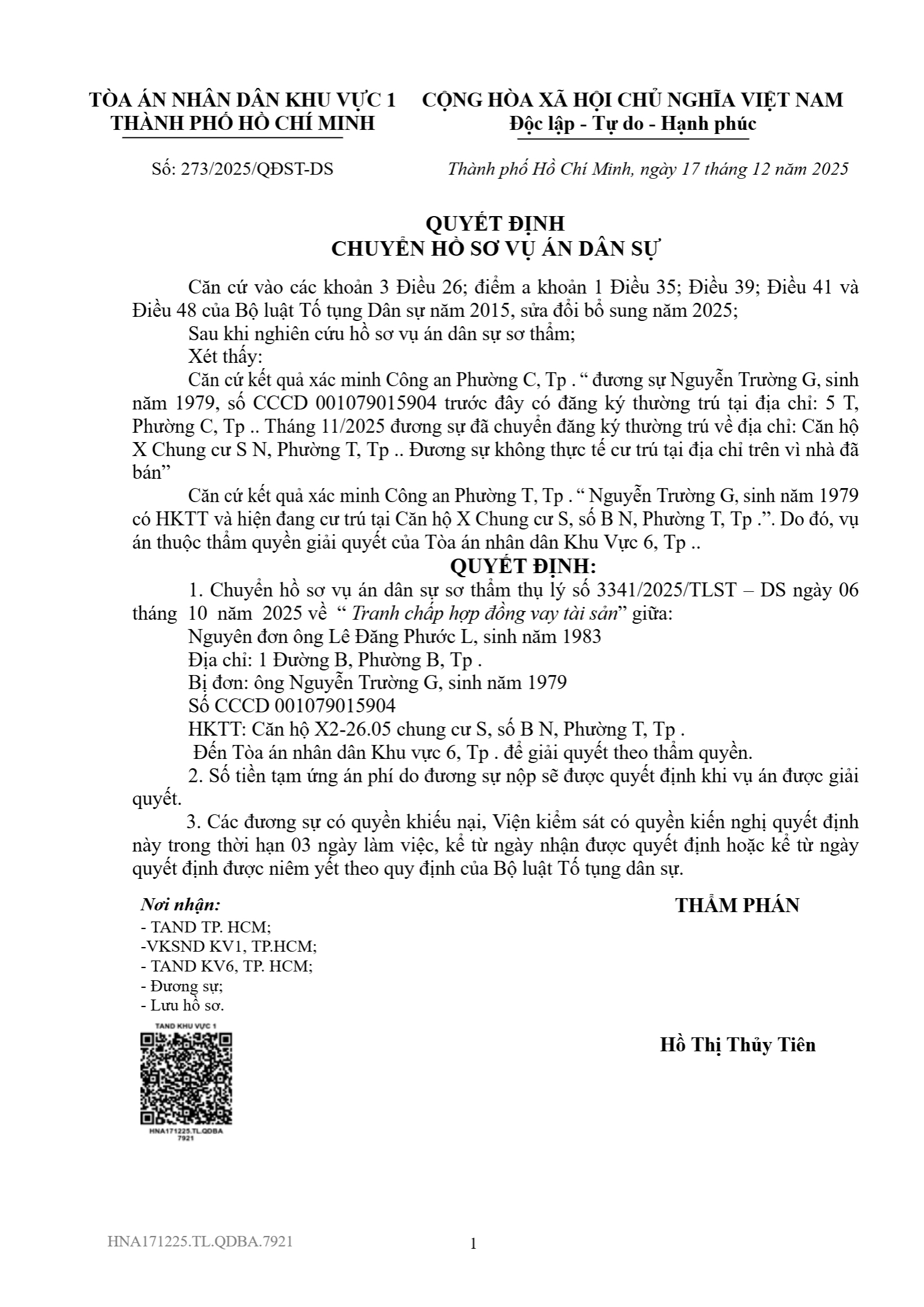 | Tên Quyết định: | Quyết định số 273/2025/QĐST-DS ngày 17/12/2025 của Tòa án nhân dân khu vực 1 - Hồ Chí Minh, TP. Hồ Chí Minh về tranh chấp hợp đồng vay tài sản |