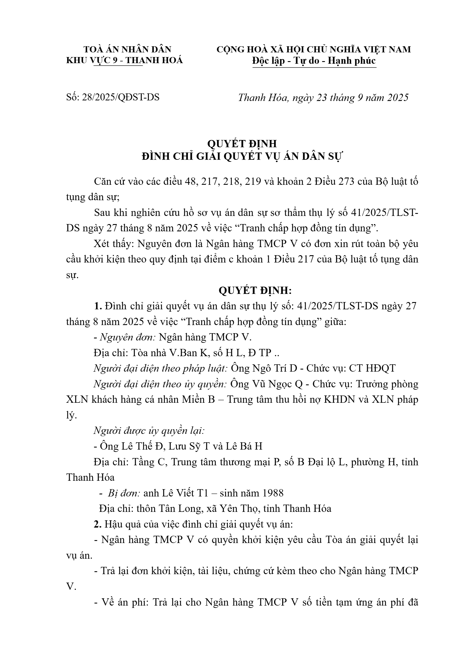 Quyết định số 28/2025/QĐST-DS ngày 23/09/2025 của Tòa án nhân dân khu vực 9 - Thanh Hóa, tỉnh Thanh Hóa về tranh chấp hợp đồng tín dụng