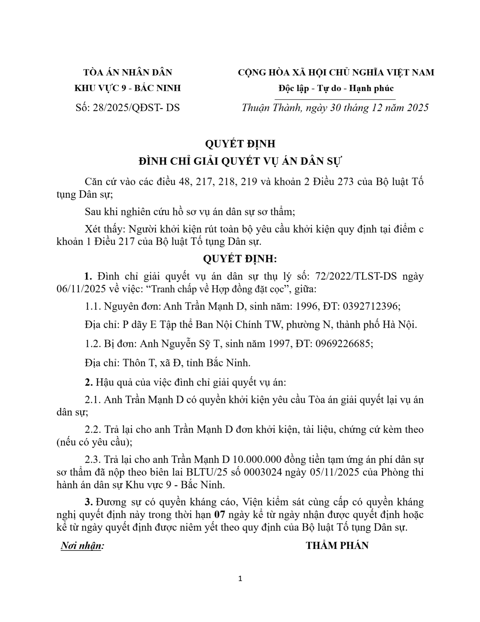 Quyết định số 28/2025/QĐST-DS ngày 30/12/2025 của Tòa án nhân dân khu vực 9 - Bắc Ninh, tỉnh Bắc Ninh về tranh chấp hợp đồng đặt cọc