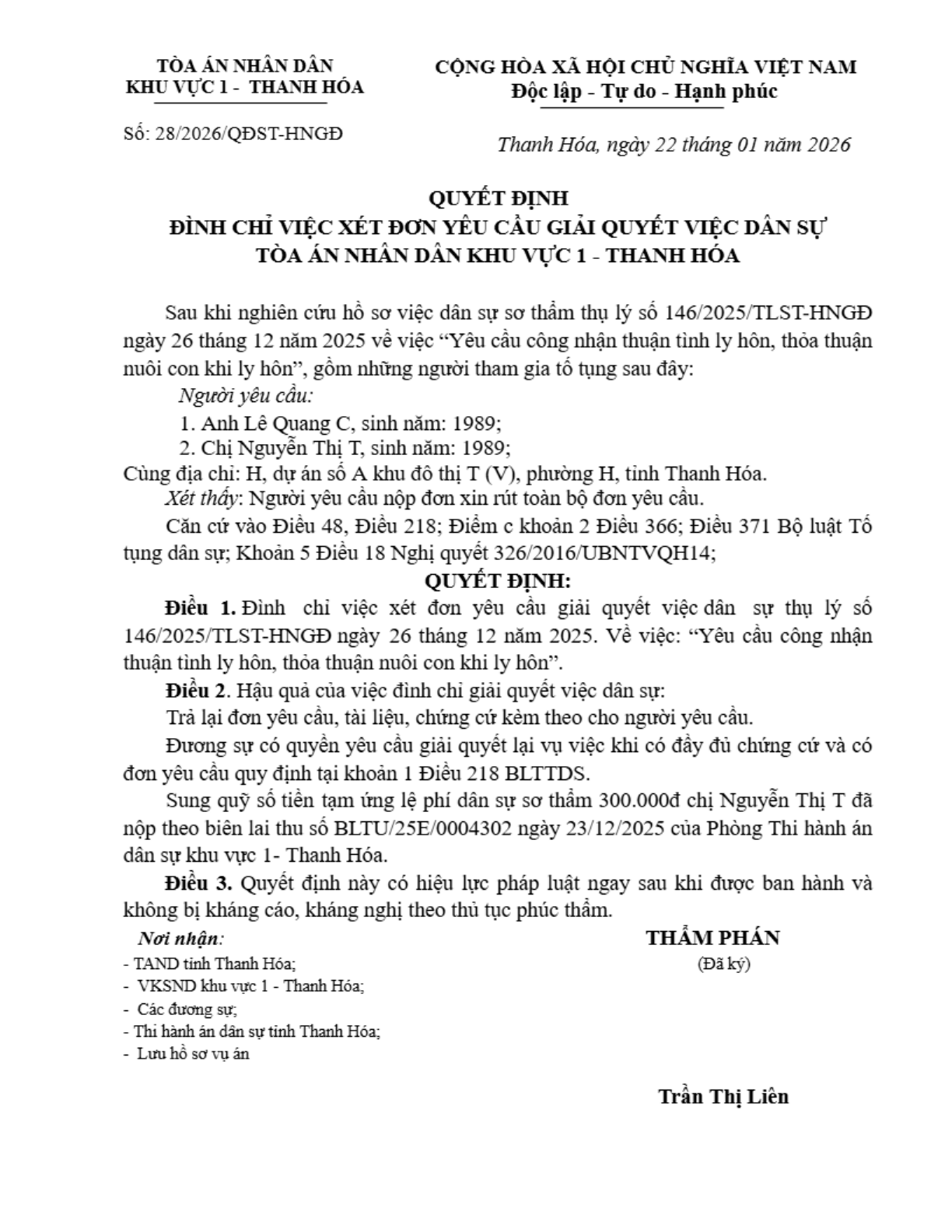 Quyết định số 28/2026/QĐST-HNGĐ ngày 22/01/2026 của Tòa án nhân dân khu vực 1 - Thanh Hóa, tỉnh Thanh Hóa về yêu cầu công nhận thuận tình ly hôn