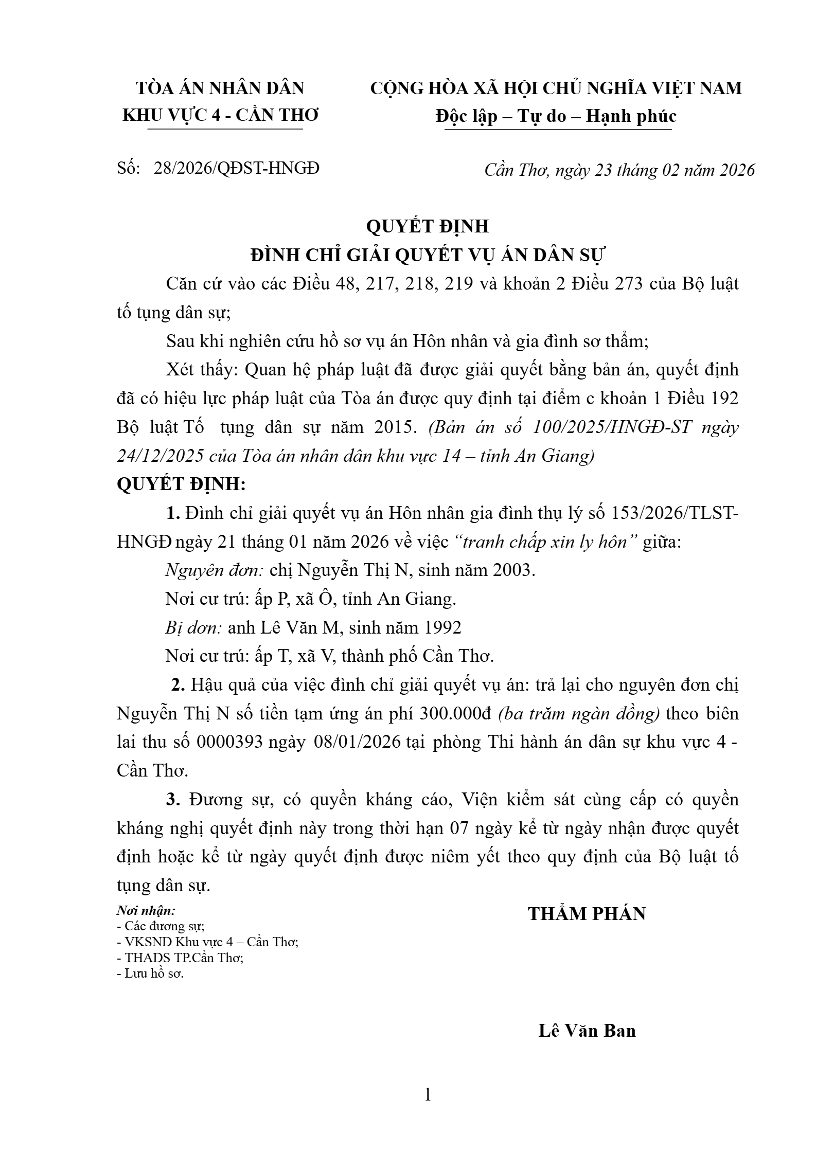 | Tòa án xét xử: | Tòa án nhân dân khu vực 4 - Cần Thơ, TP. Cần Thơ |