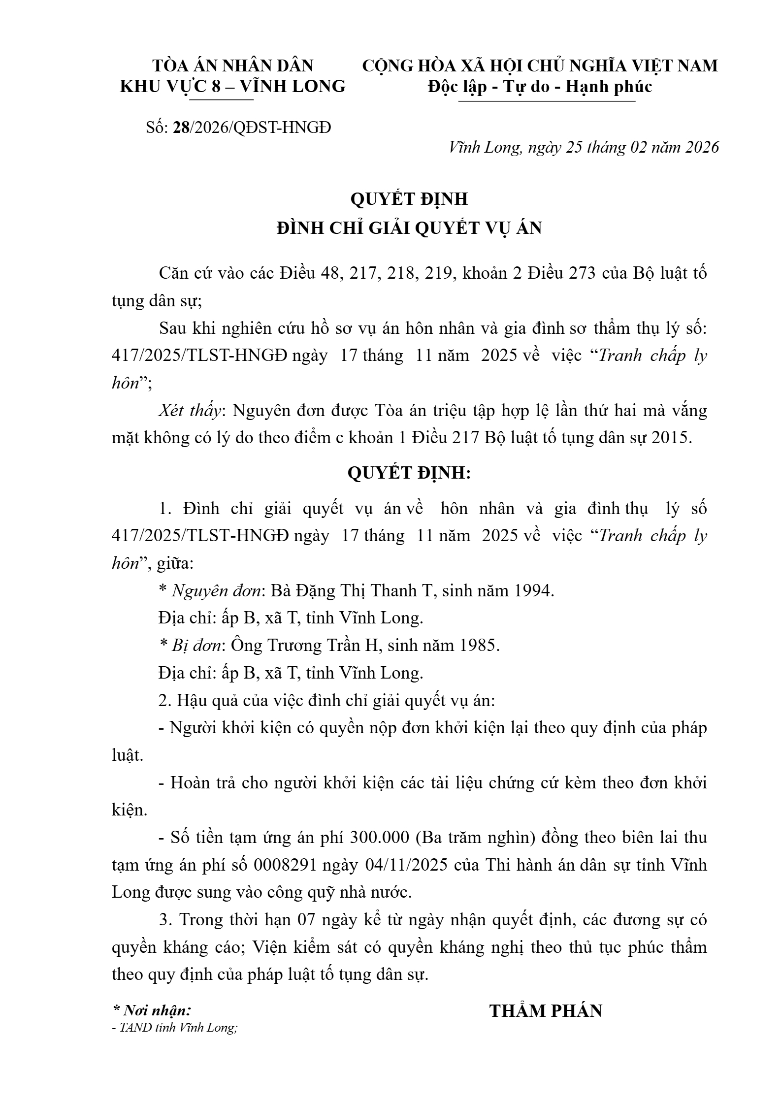 Quyết định số 28/2026/QĐST-HNGĐ ngày 25/02/2026 của Tòa án nhân dân khu vực 8 - Vĩnh Long, tỉnh Vĩnh Long về vụ án ly hôn về mâu thuẫn gia đình